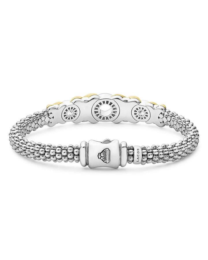 This 18K Yellow Gold & Sterling Silver Embrace Diamond XO Caviar Bead Link Bracelet by LAGOS is a stunning testament to the art of jewelry design. From the Embrace collection, it features a trio of dazzling diamond circles accented by rich gold X motifs. The signature Caviar beading adds texture and dimension, creating a piece that is both bold and sophisticated. A versatile accessory that exudes elegance.