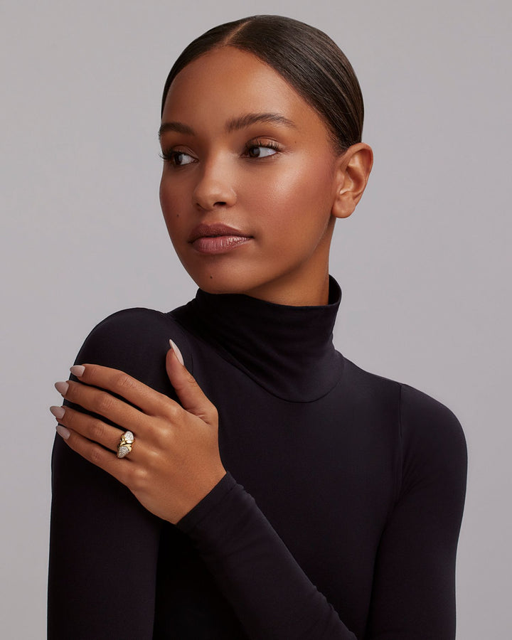 Handcrafted in sterling silver with 18K yellow gold accents. Features diamond pavé totaling approximately 0.77 carats (GH color, SI clarity). Some silver elements may be rhodium-coated for enhanced shine and durability.