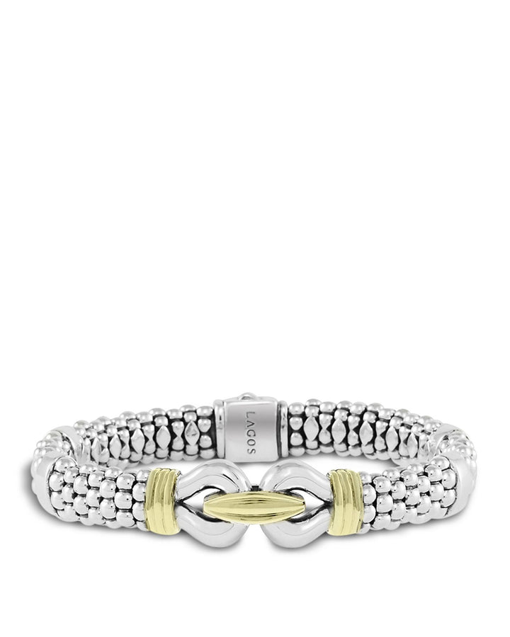 This 18K Gold & Sterling Silver Derby Bracelet by LAGOS combines shiny silver with luxurious gold accents for a versatile design that complements pieces in any metal color. A classic addition to any jewelry collection.