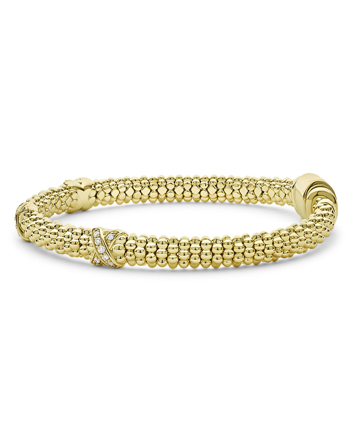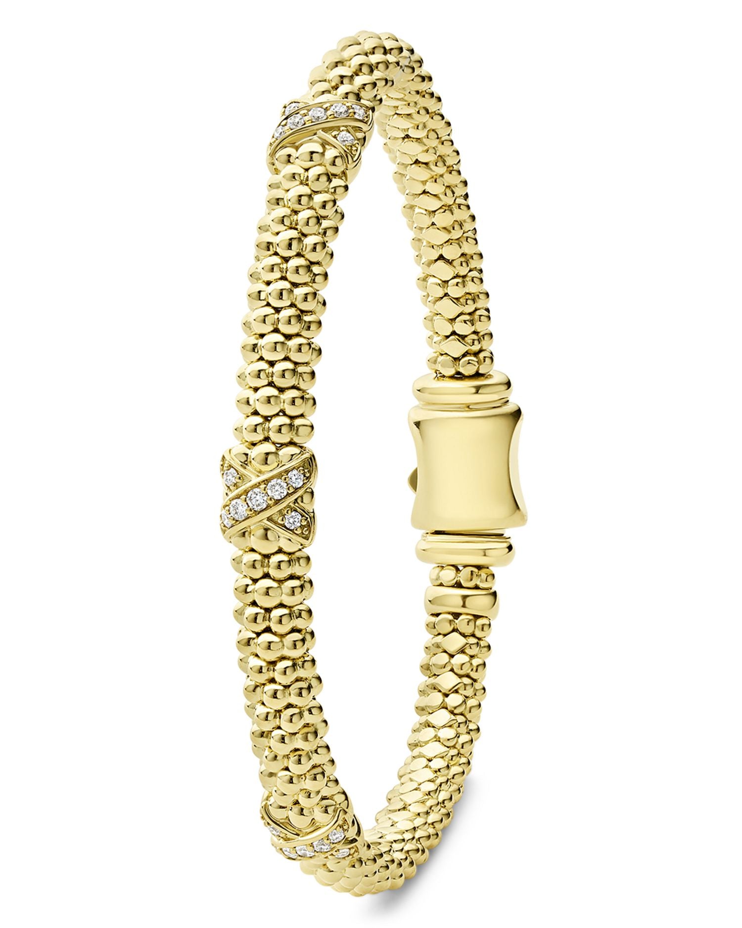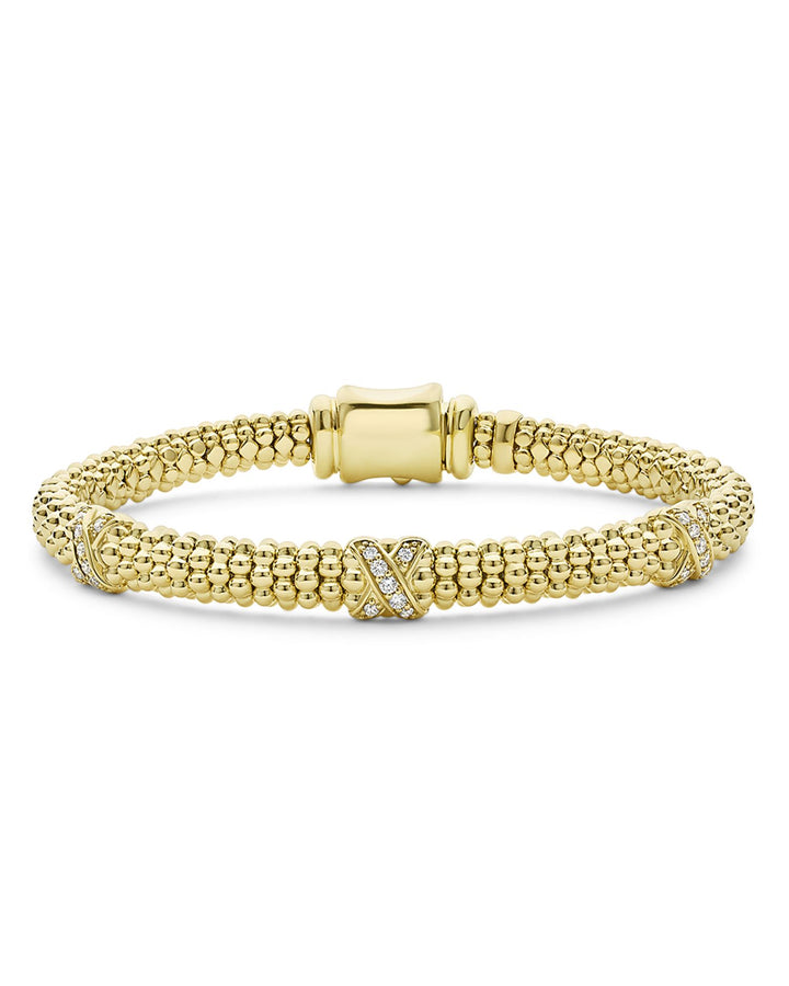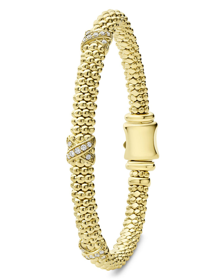 This 18K Yellow Gold Embrace Diamond Triple X Caviar Bead Bracelet by LAGOS is a timeless statement of sophistication. From the Embrace collection, this piece features a trio of shimmery diamond X motifs that radiate elegance against the warm glow of 18K gold Caviar beads. Its versatile design makes it perfect for enhancing both formal and everyday looks, showcasing LAGOS's signature artistry and luxurious craftsmanship.