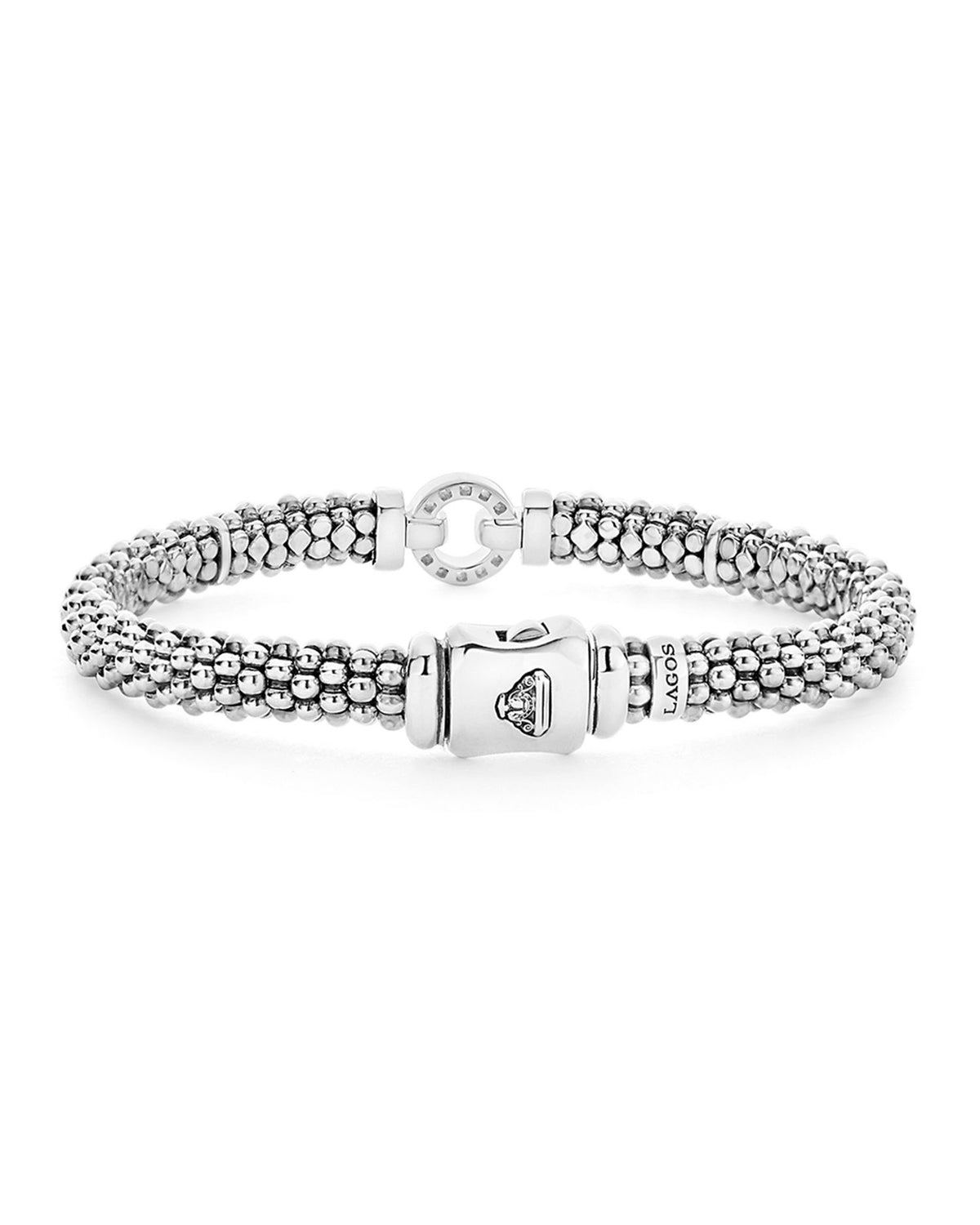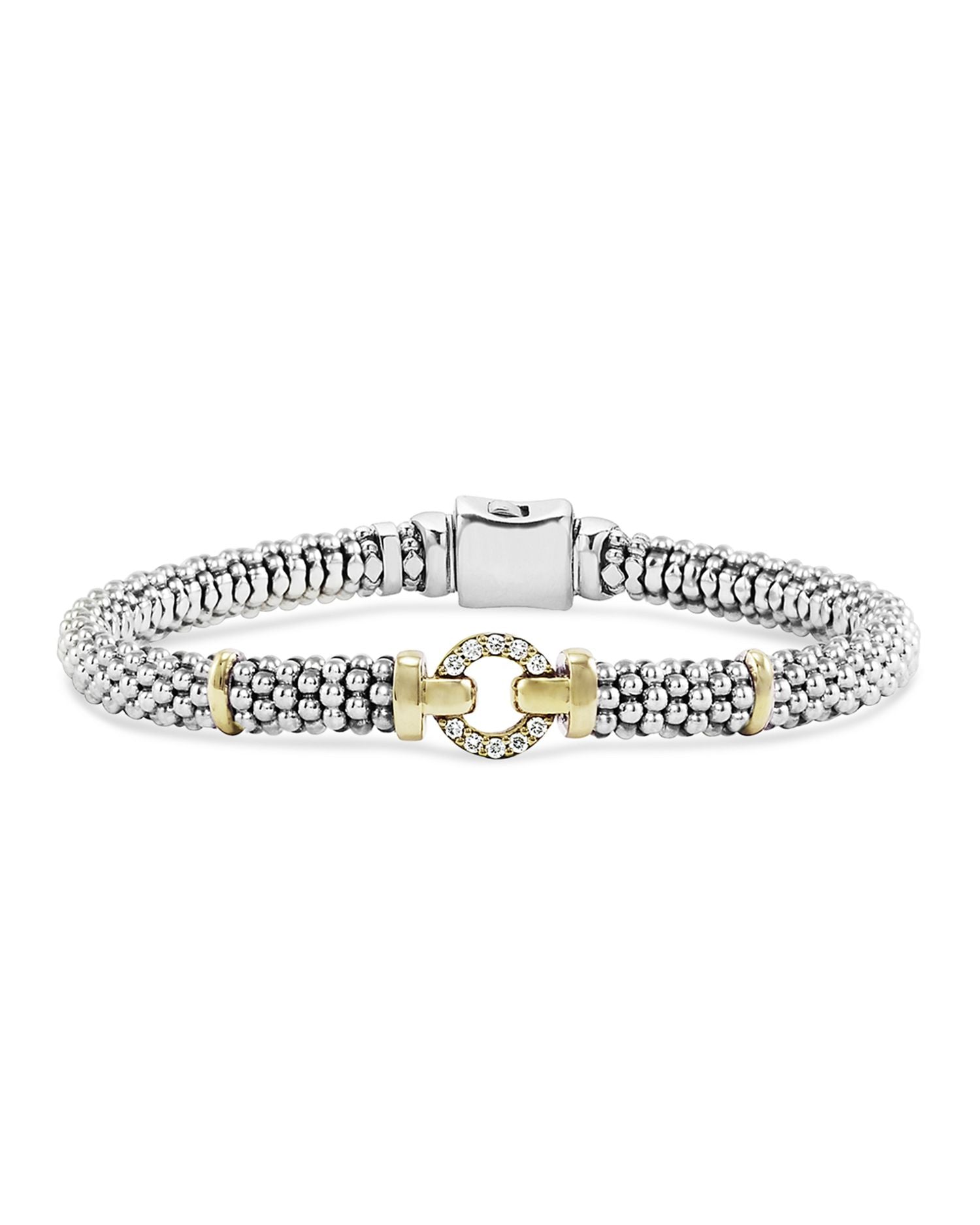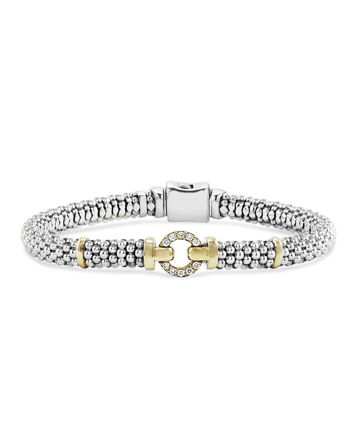 These 18K Yellow Gold & Sterling Silver Caviar & Diamonds Rope Bracelets by LAGOS offer a wide silhouette and a luxurious two-tone design. Perfect for stacking with other cuffs and bracelets, this piece combines beaded elegance with diamond accents.