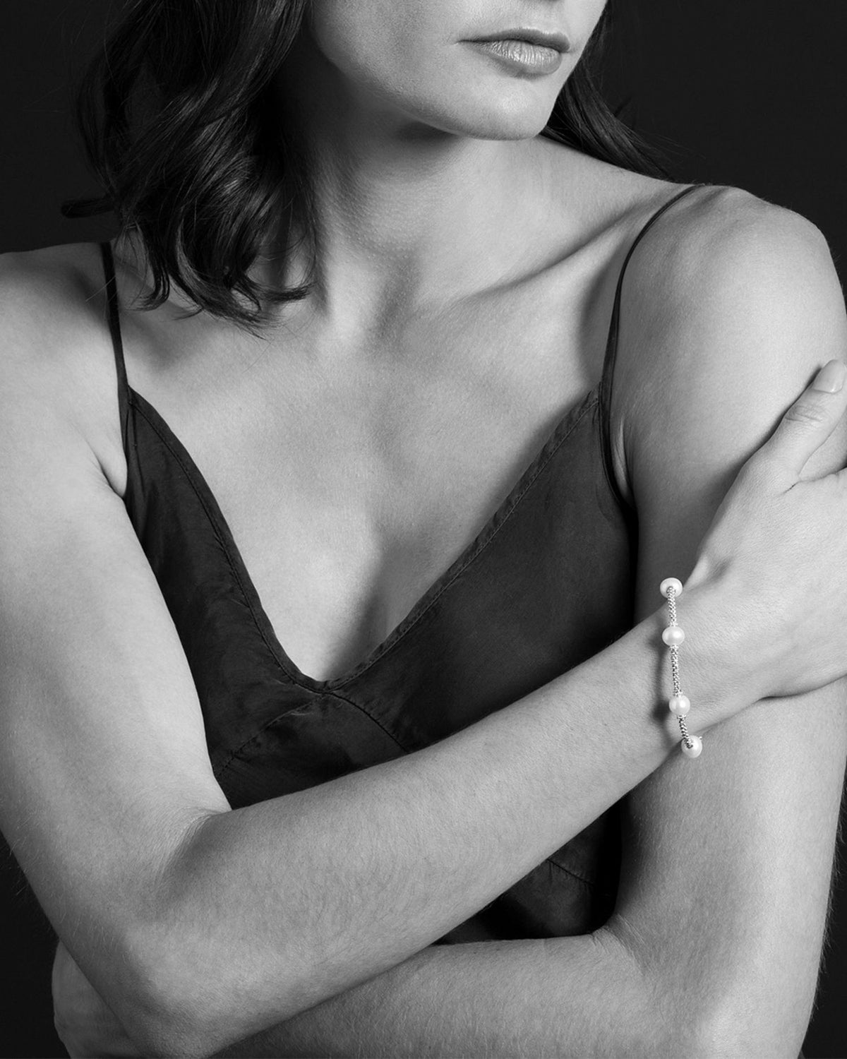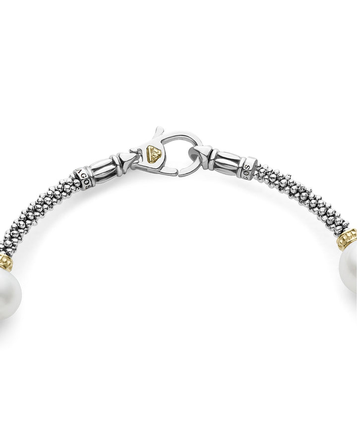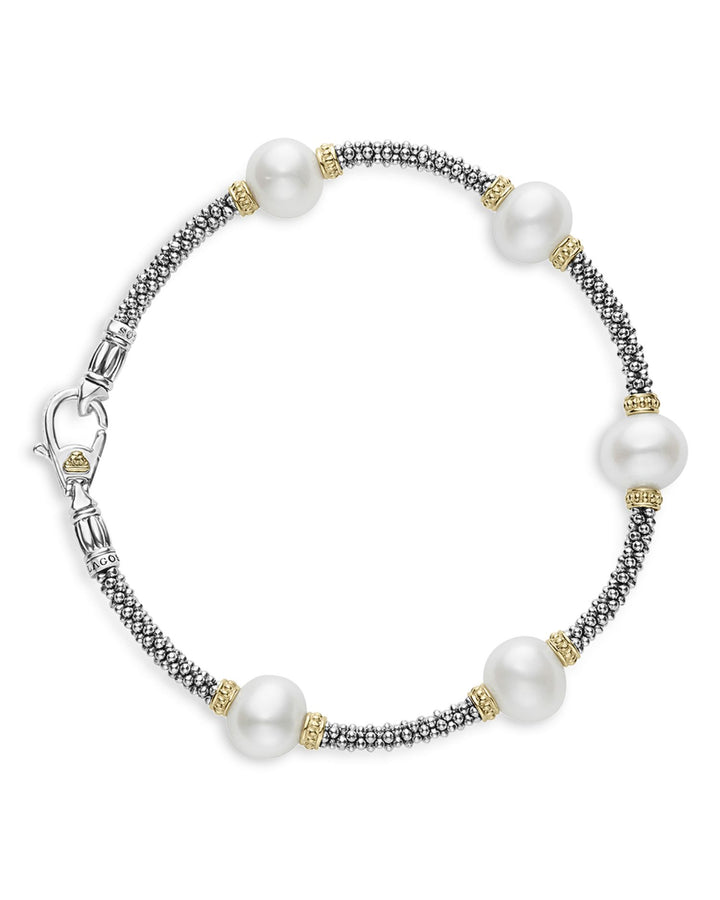 This Sterling Silver & 18K Yellow Gold Luna Cultured Freshwater Pearl Station Bracelet by LAGOS from the Luna Collection is a sophisticated design featuring five luminous freshwater cultured pearl stations set along the signature Caviar beading.