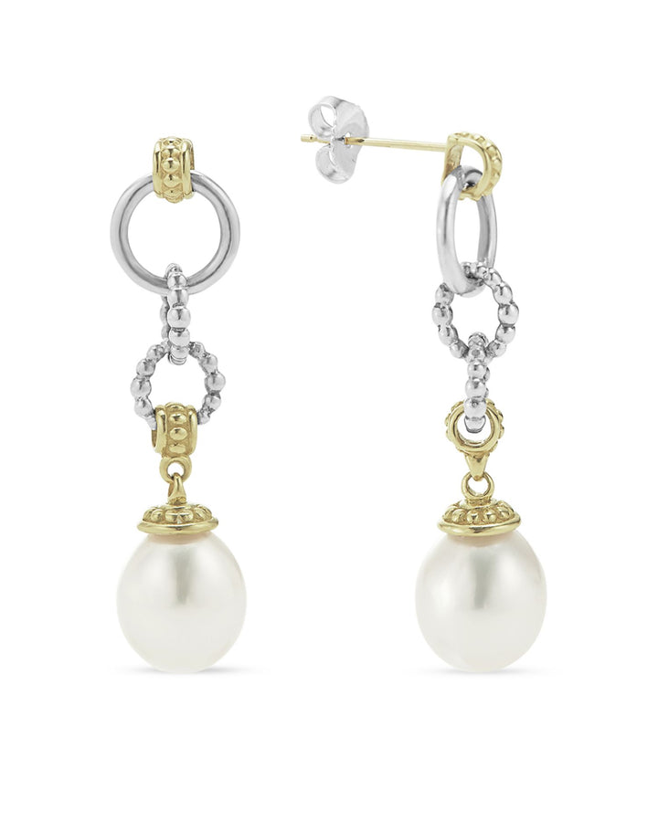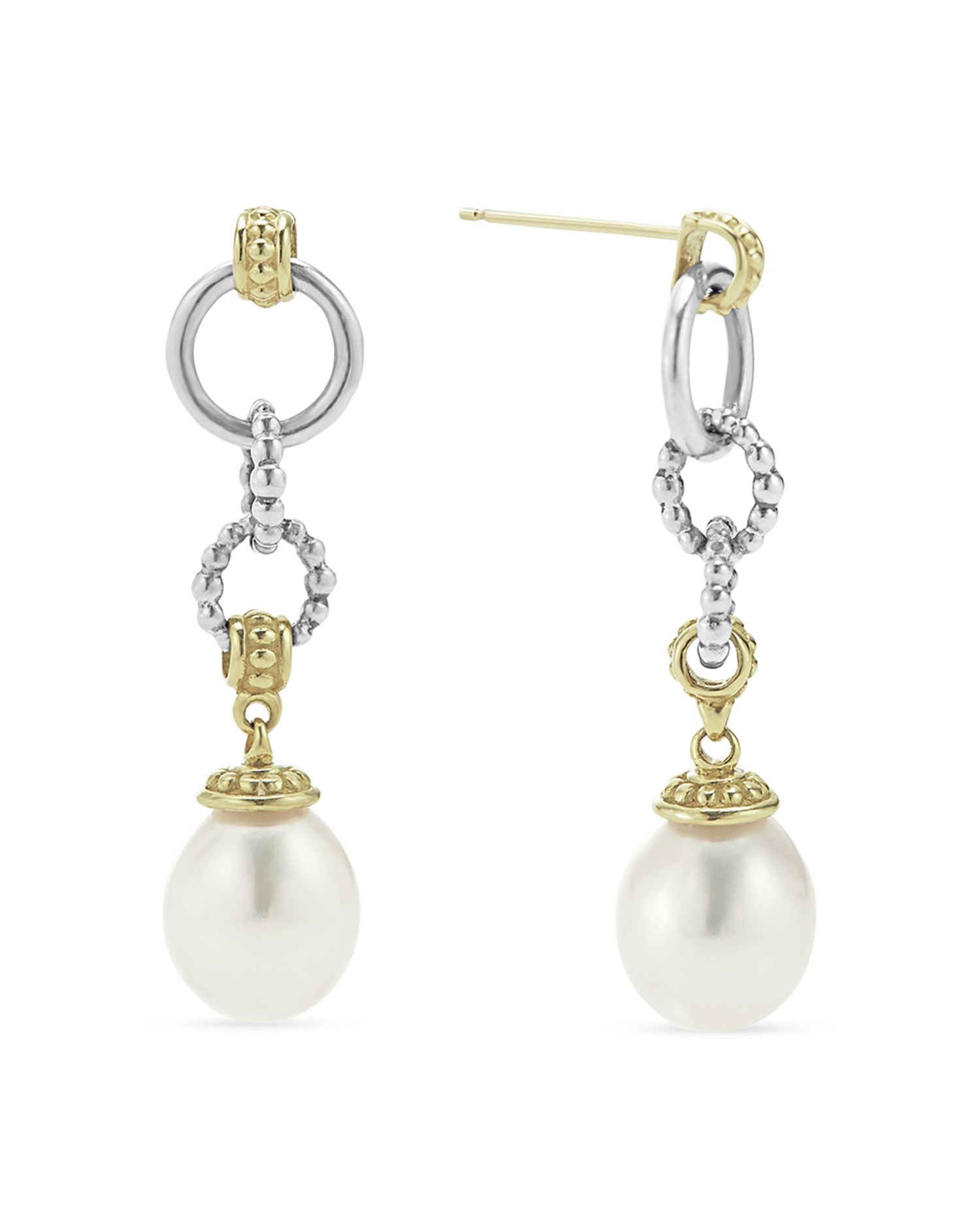 These 18K Gold & Sterling Silver Two-Tone Luna Cultured Pearl Circle Drop Earrings by LAGOS showcase a graceful design from the Luna collection. Featuring luminous pearl drops suspended from Caviar beaded hoops, the mix of sterling silver and 18K gold adds a sophisticated two-tone effect. Perfect for adding an elegant touch to any ensemble.
