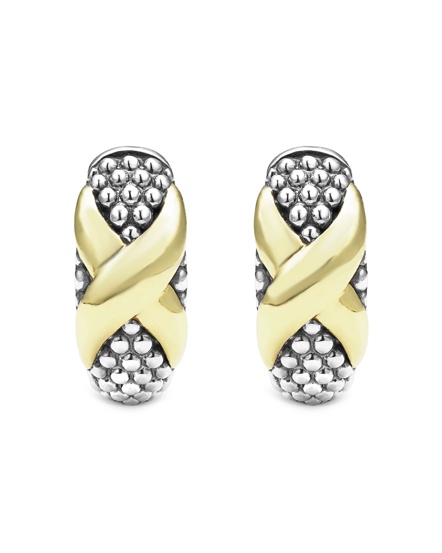 These 18K Yellow Gold & Sterling Silver Embrace X Caviar Bead Small Hoop Earrings by LAGOS are a bold yet elegant addition to any jewelry wardrobe. From the Embrace collection, their two-tone design features striking gold X motifs and sterling silver Caviar beads, creating a timeless and versatile look.