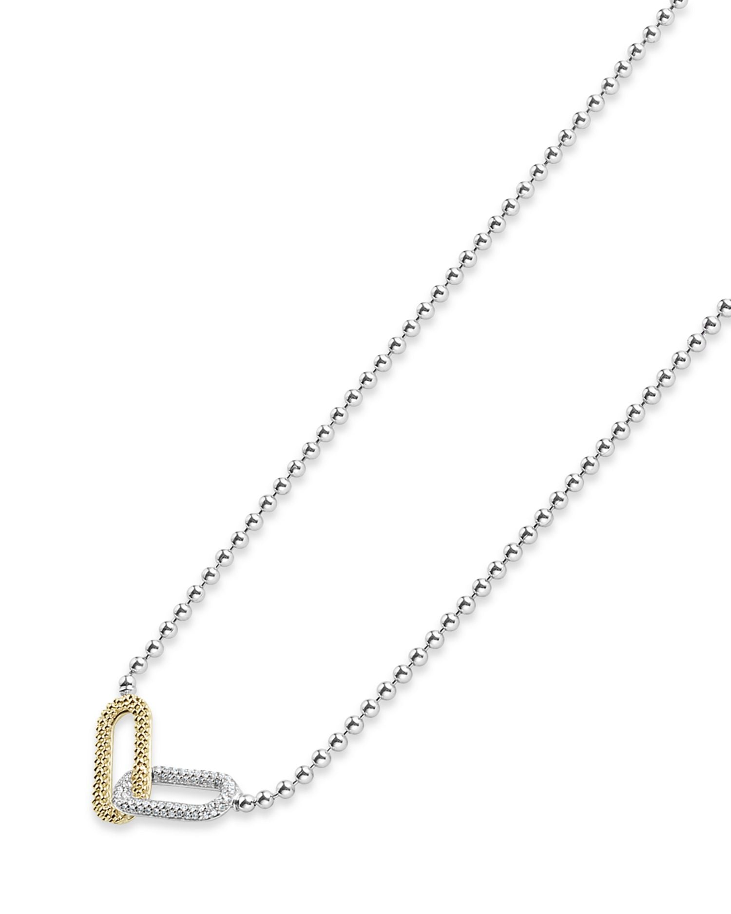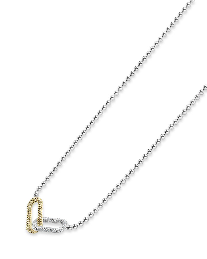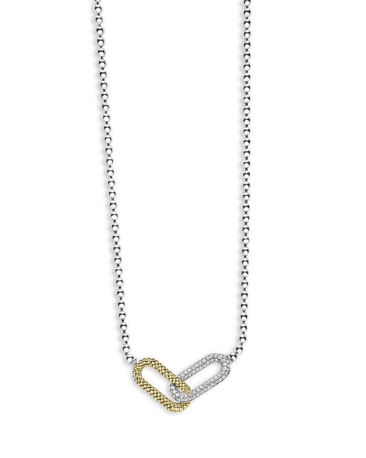 This 18K Yellow Gold & Sterling Silver Caviar Lux-Clip Diamond Bead Link Necklace by LAGOS is a bold, exclusive design from the Caviar Lux-Clip collection. Featuring two-tone intertwined links with sparkling diamonds, this necklace is a sophisticated statement piece for any occasion.