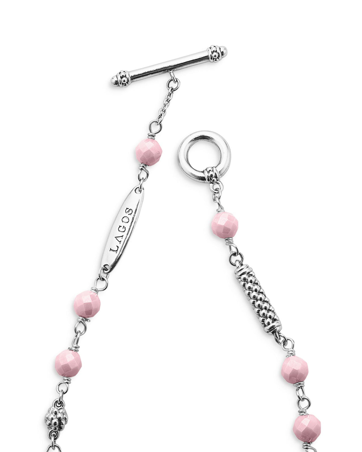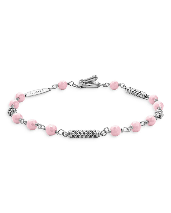 Handcrafted in sterling silver with pink ceramic beads. Bracelet measures 7.75 inches in length and secures with a toggle clasp closure. Some silver components may be rhodium-coated for enhanced shine and durability.