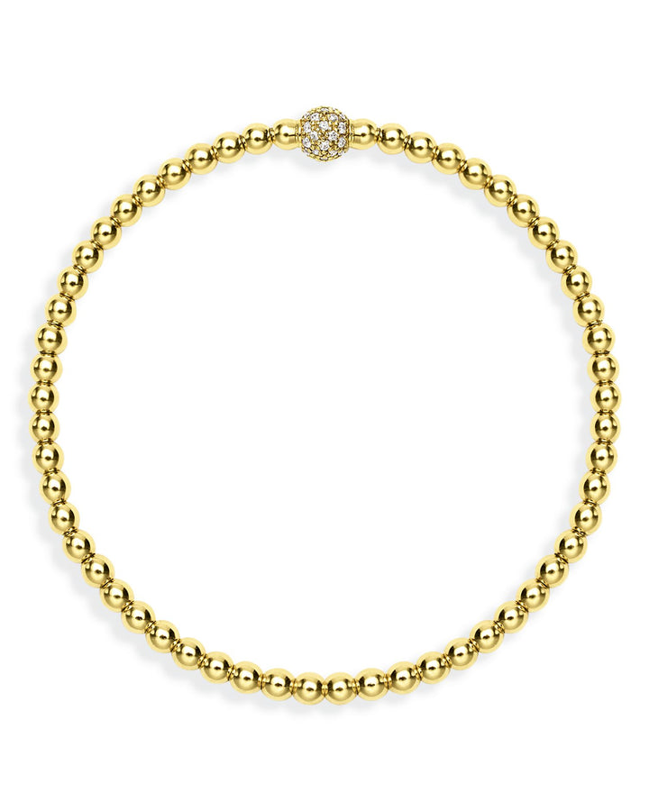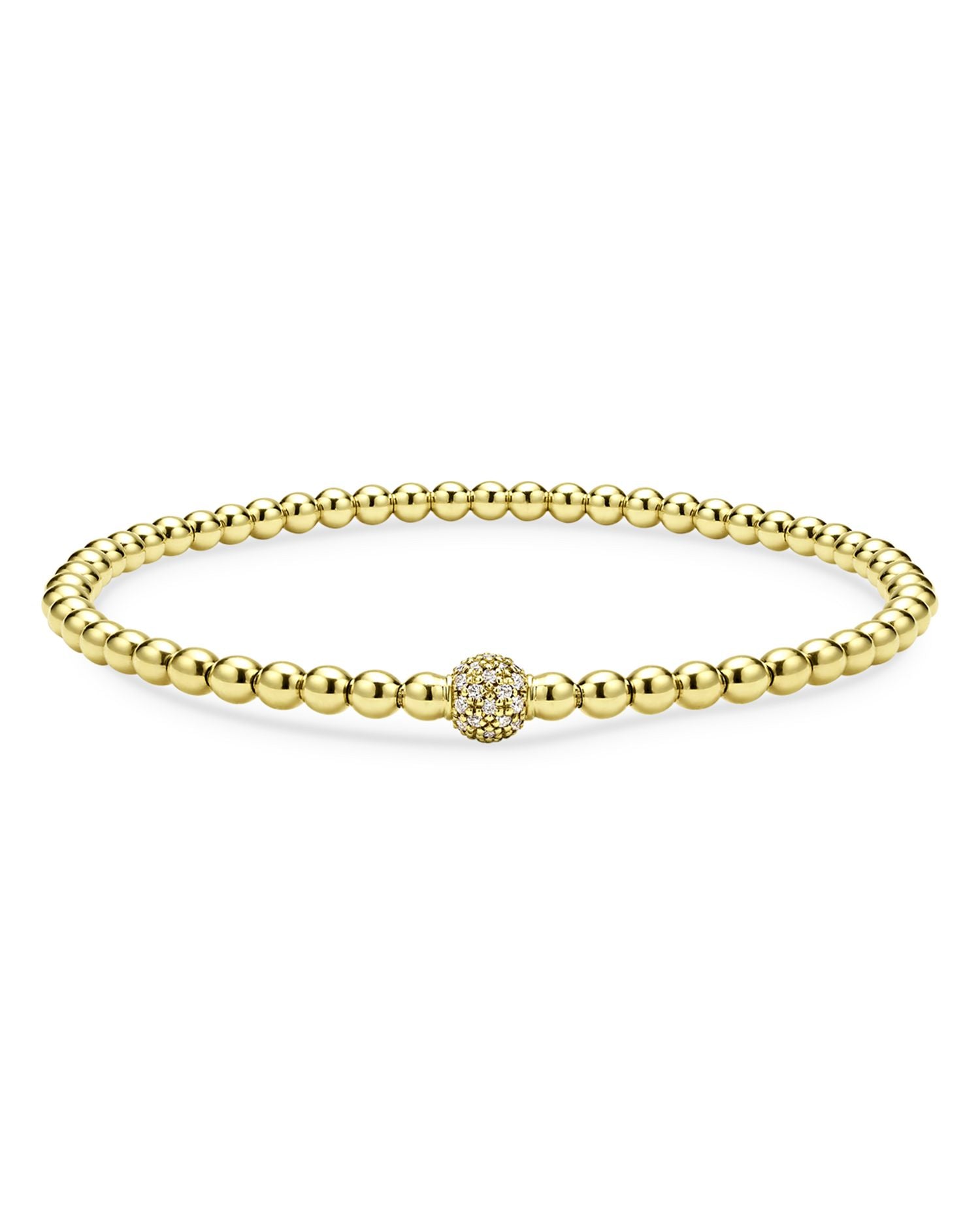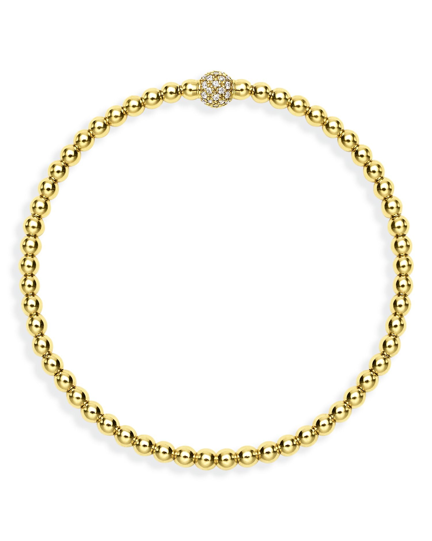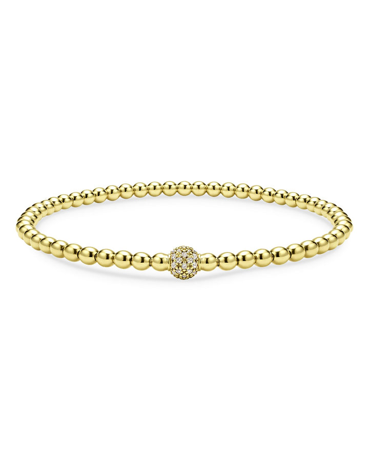 This 18K Yellow Gold Caviar Diamond Pavé Ball Stretch Bracelet by LAGOS from the Caviar Gold Collection is a striking piece featuring a single pavé diamond sphere. Its beaded stretch design combines luxury with effortless wearability.