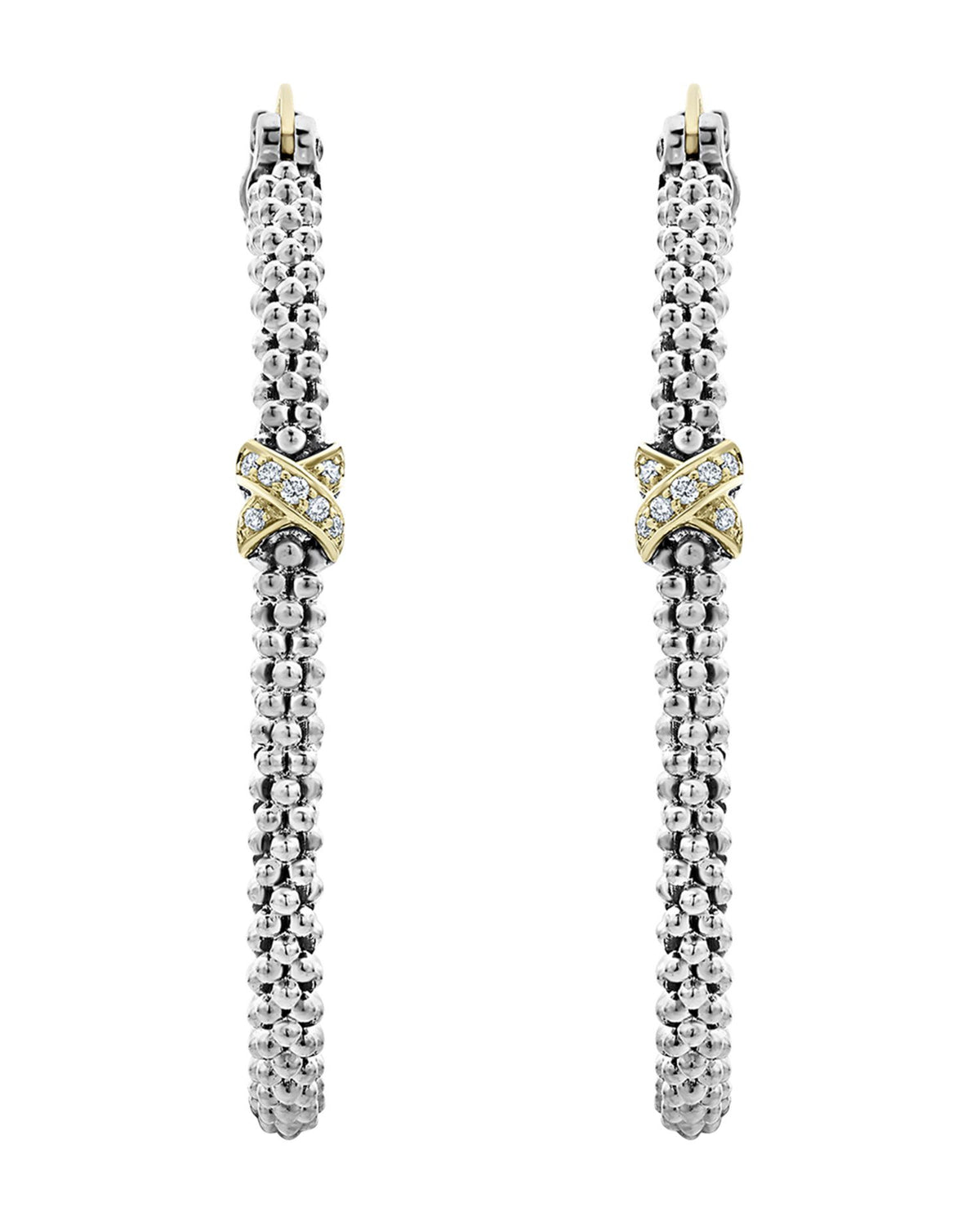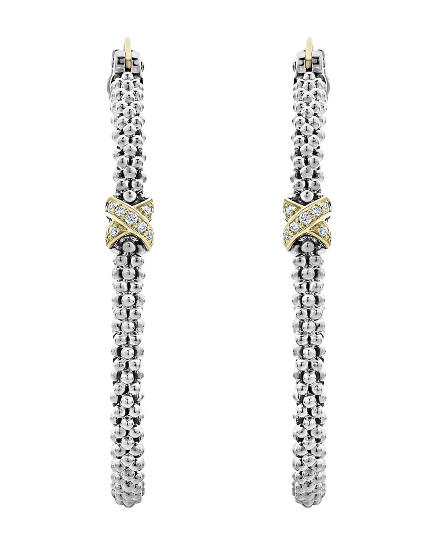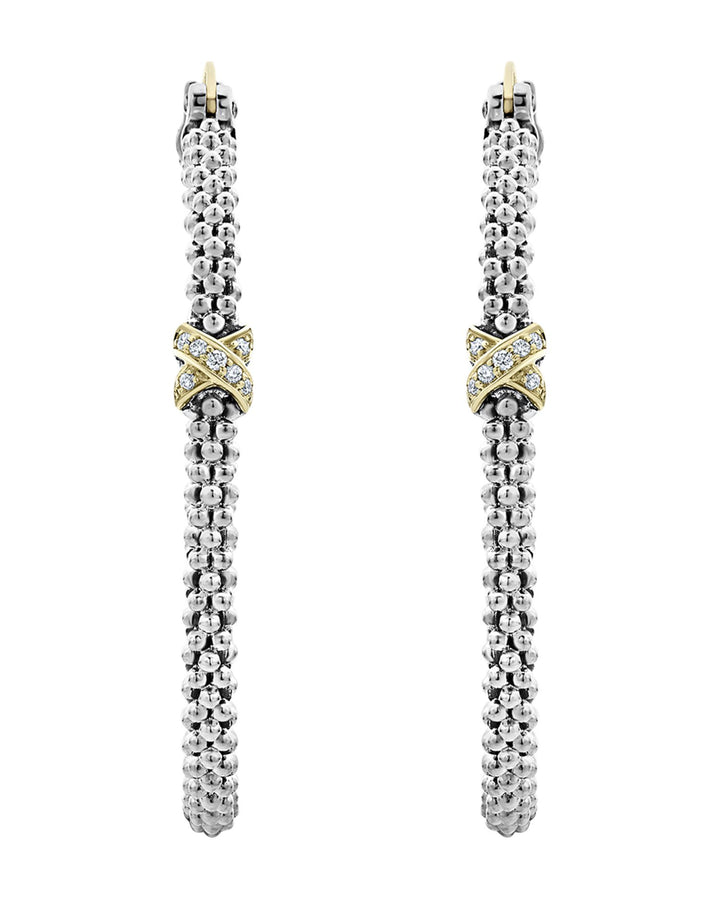 These Sterling Silver & 18K Yellow Gold Embrace Diamond Hoop Earrings by LAGOS bring elegance and sparkle to the iconic Caviar design. From the Embrace collection, they feature signature Caviar beaded hoops accented with a diamond X station for a sophisticated touch.