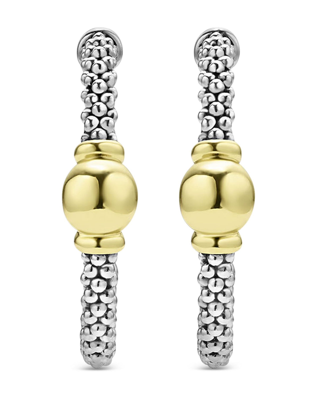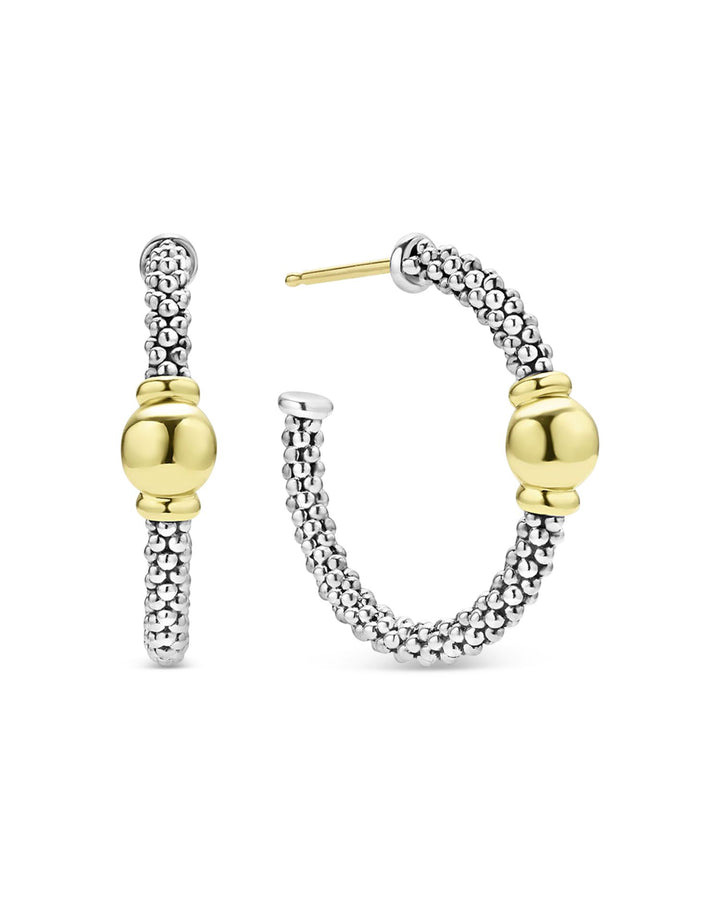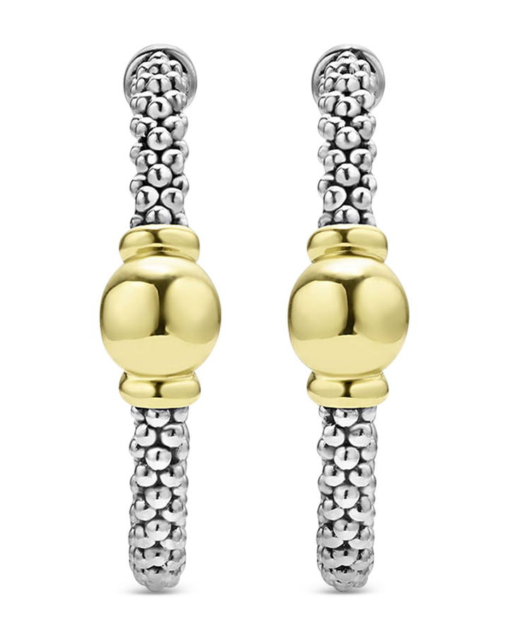 These 18K Yellow Gold & Sterling Silver Signature Caviar Station Hoop Earrings by LAGOS are an elegant addition to the Signature Caviar collection. Featuring Caviar beaded hoops accented with polished 18K yellow gold ball details, these earrings offer a sophisticated and versatile design perfect for day-to-night wear.