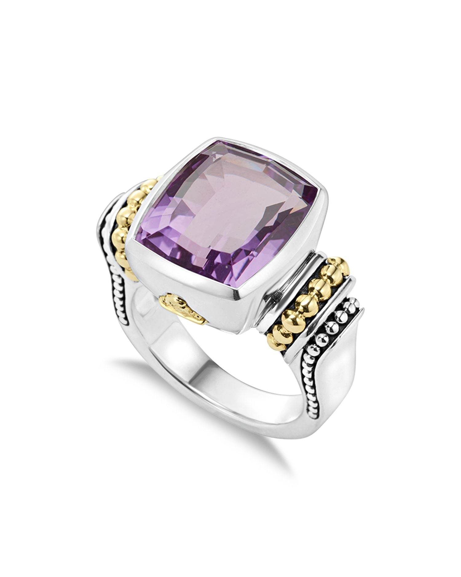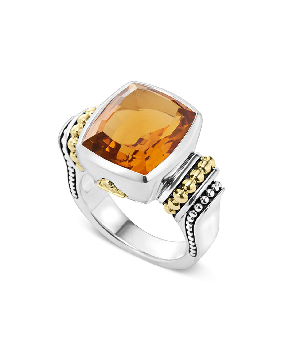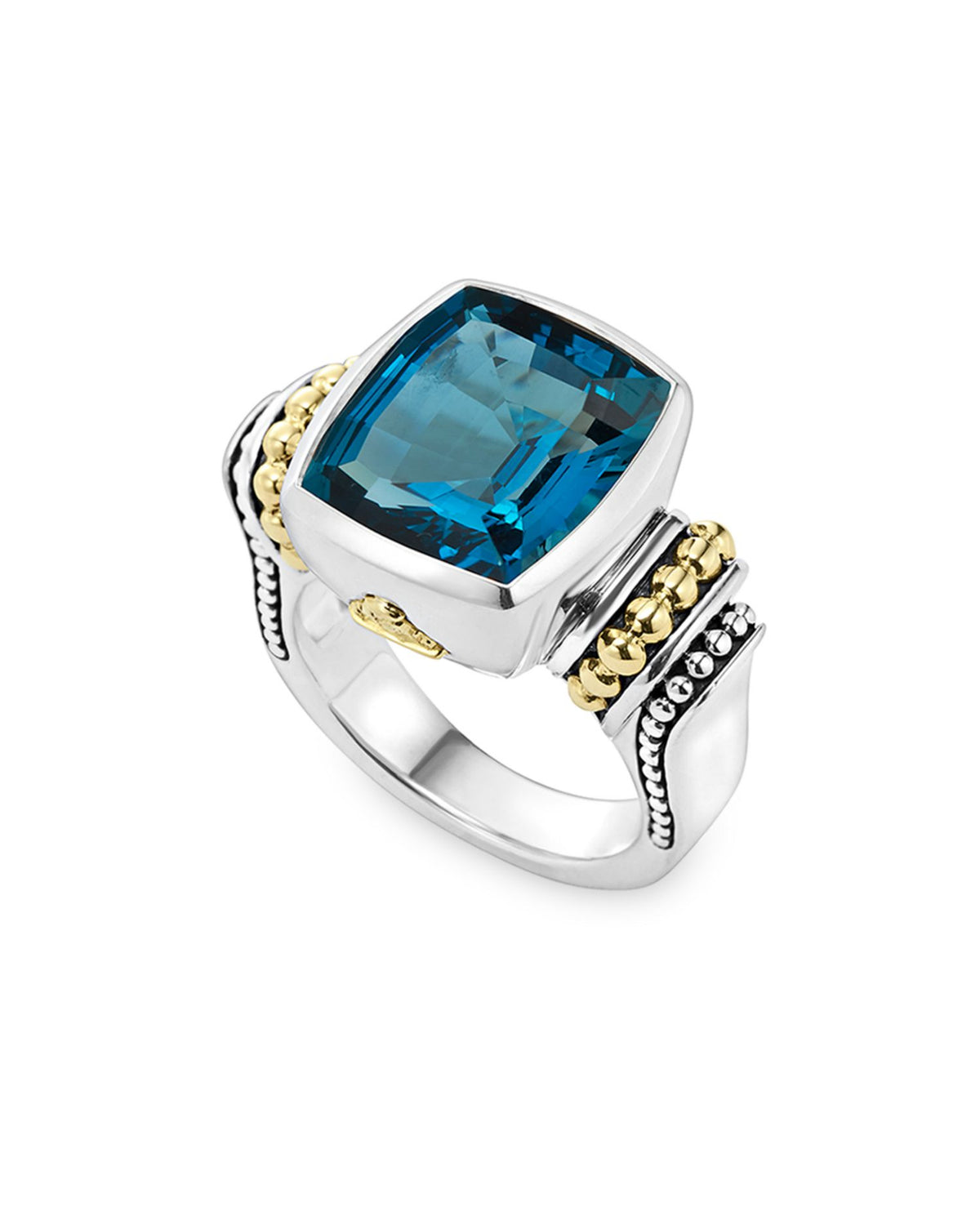These 18K Gold and Sterling Silver Caviar Color Medium Rings with Gemstone by LAGOS are bold and sophisticated. Featuring faceted gemstones atop a striking band with rows of signature Caviar beading in sterling silver and 18K gold, these rings are perfect for making a statement. Ideal for stacking or wearing solo to showcase their vibrant design.
