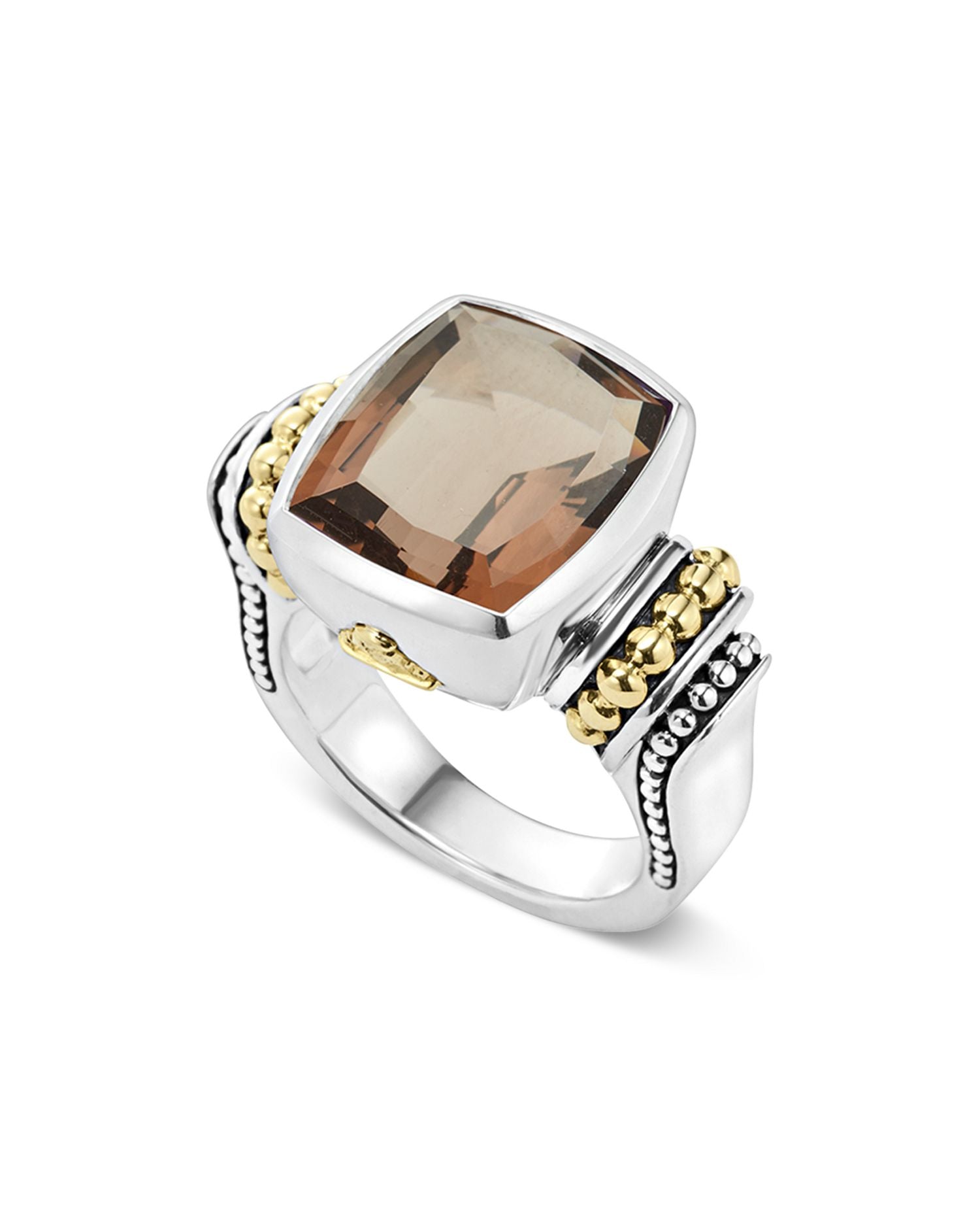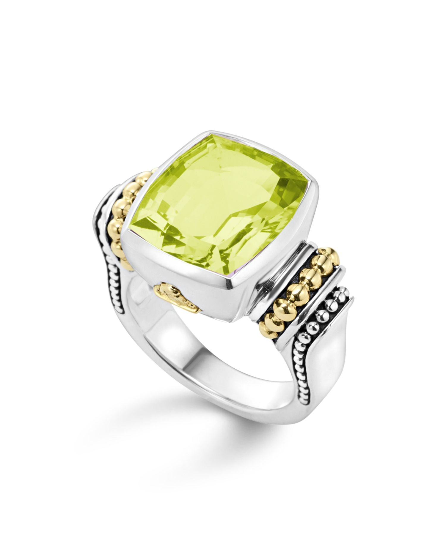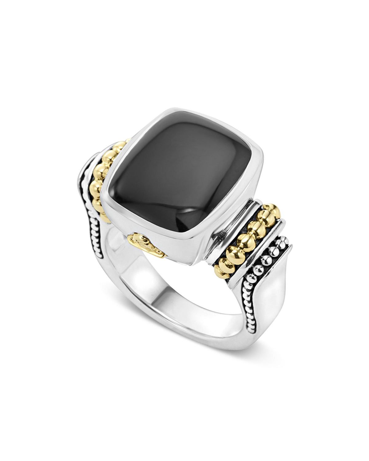 These 18K Gold and Sterling Silver Caviar Color Medium Rings with Gemstone by LAGOS are bold and sophisticated. Featuring faceted gemstones atop a striking band with rows of signature Caviar beading in sterling silver and 18K gold, these rings are perfect for making a statement. Ideal for stacking or wearing solo to showcase their vibrant design.