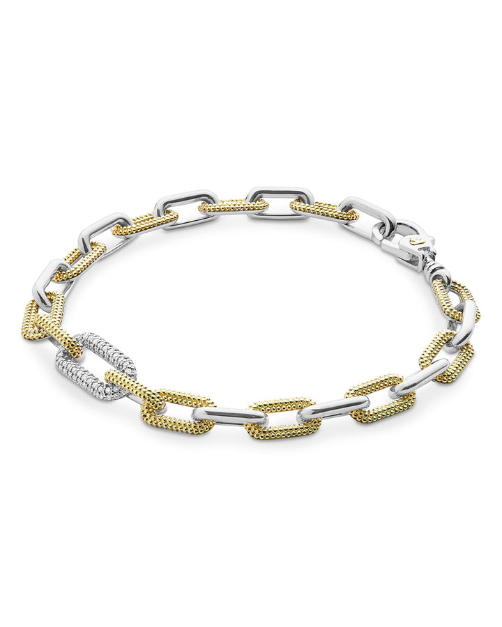 This 18K Yellow Gold & Silver Caviar Lux-Clip Diamond Link Bracelet by LAGOS from the Caviar Lux-Clip Collection showcases diamonds and two-tone links, offering a luxurious and exclusive design. Perfect for refined sophistication.