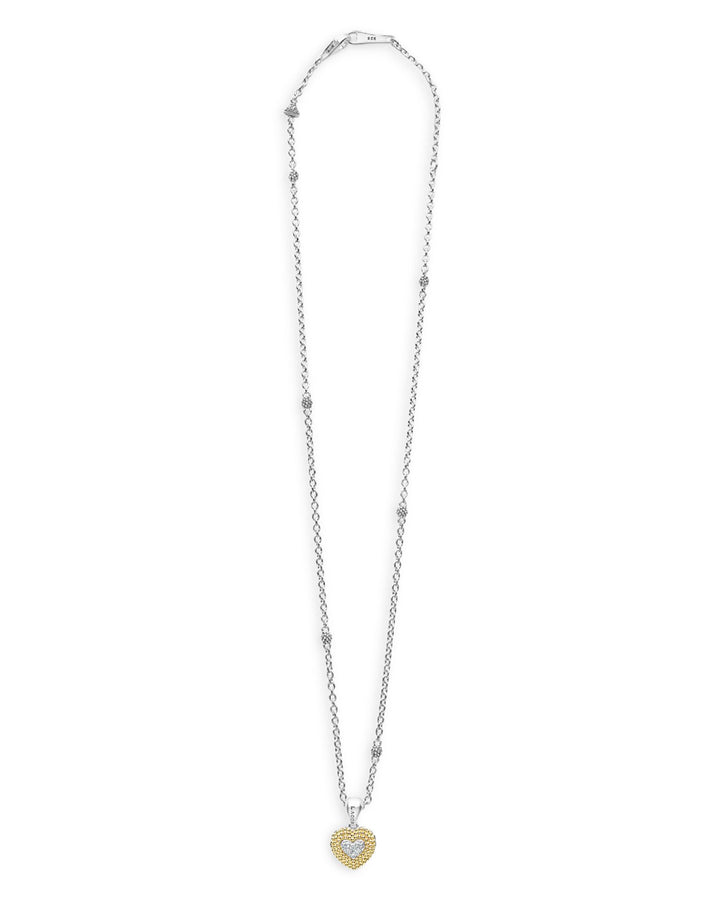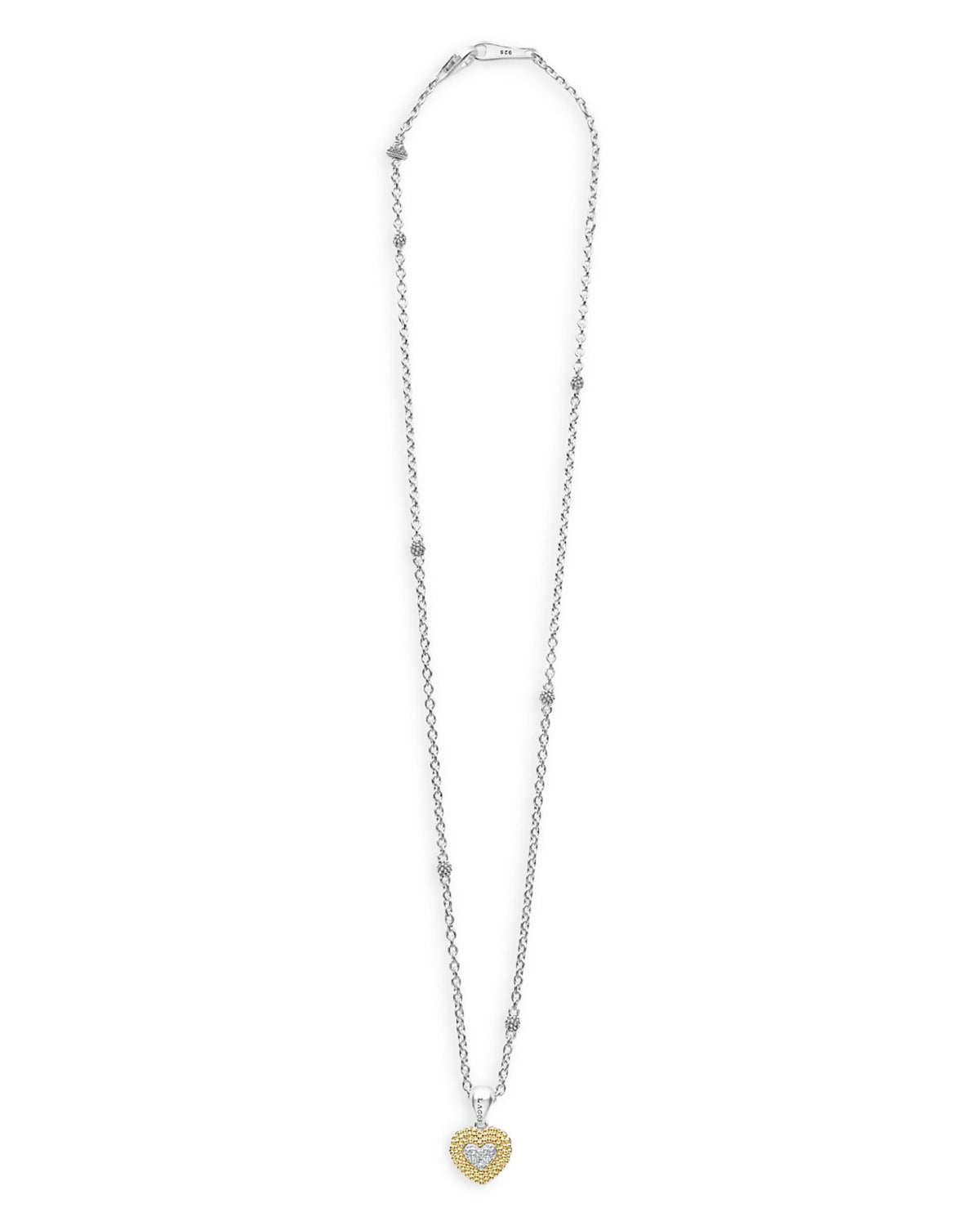 This 18K Yellow Gold & Sterling Silver Caviar Lux Diamond Heart Pendant Necklace by LAGOS is a romantic design from the Caviar Lux collection. Featuring a pavé diamond heart pendant on a signature Caviar bead station chain, this necklace adds a touch of elegance and sparkle to any look. Perfect for gifting or as a personal statement piece.