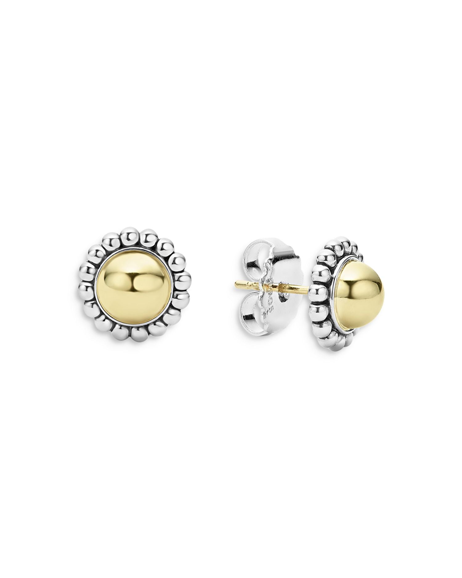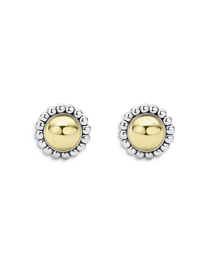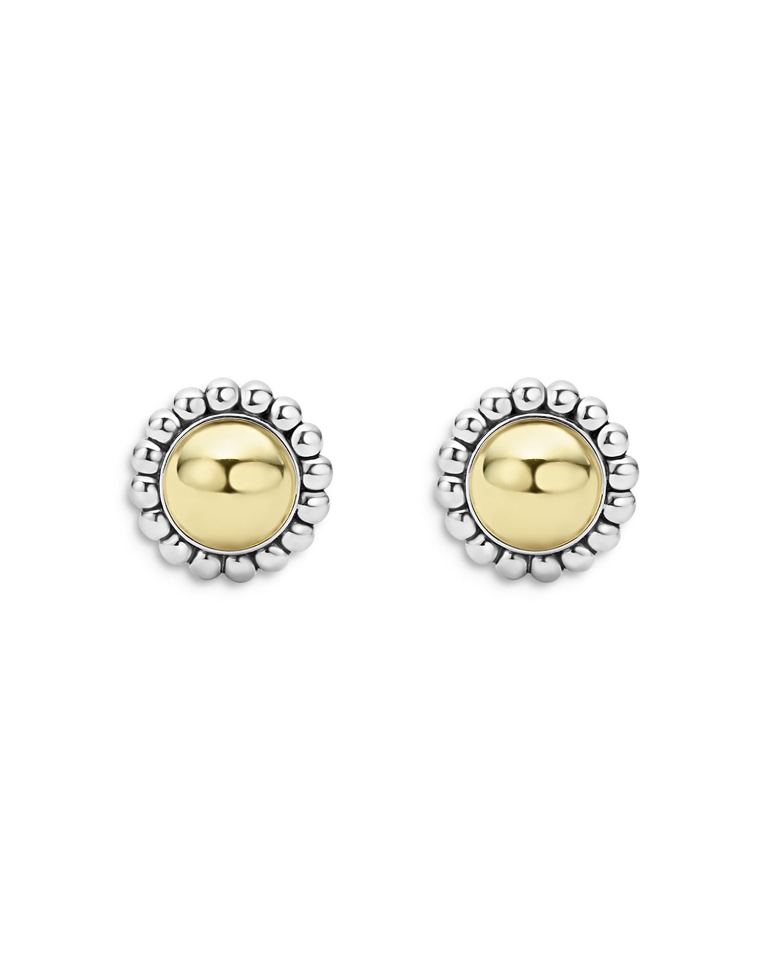 These 18K Yellow Gold & Sterling Silver High Bar Framed Stud Earrings by LAGOS are a bold and elegant addition to the High Bar collection. Featuring circular studs framed by sterling silver Caviar beading, these earrings blend modern style with timeless sophistication.