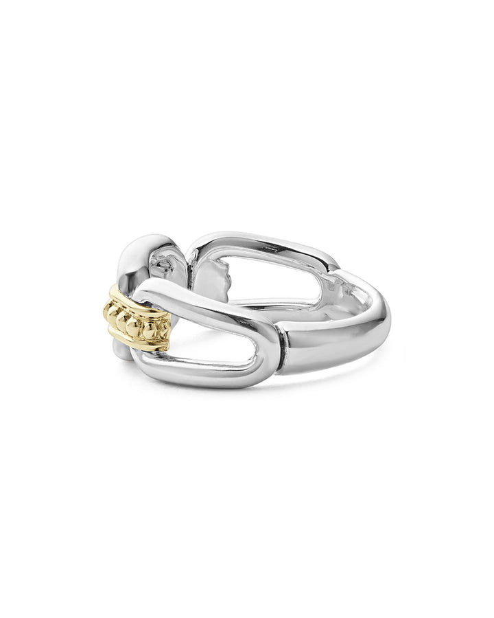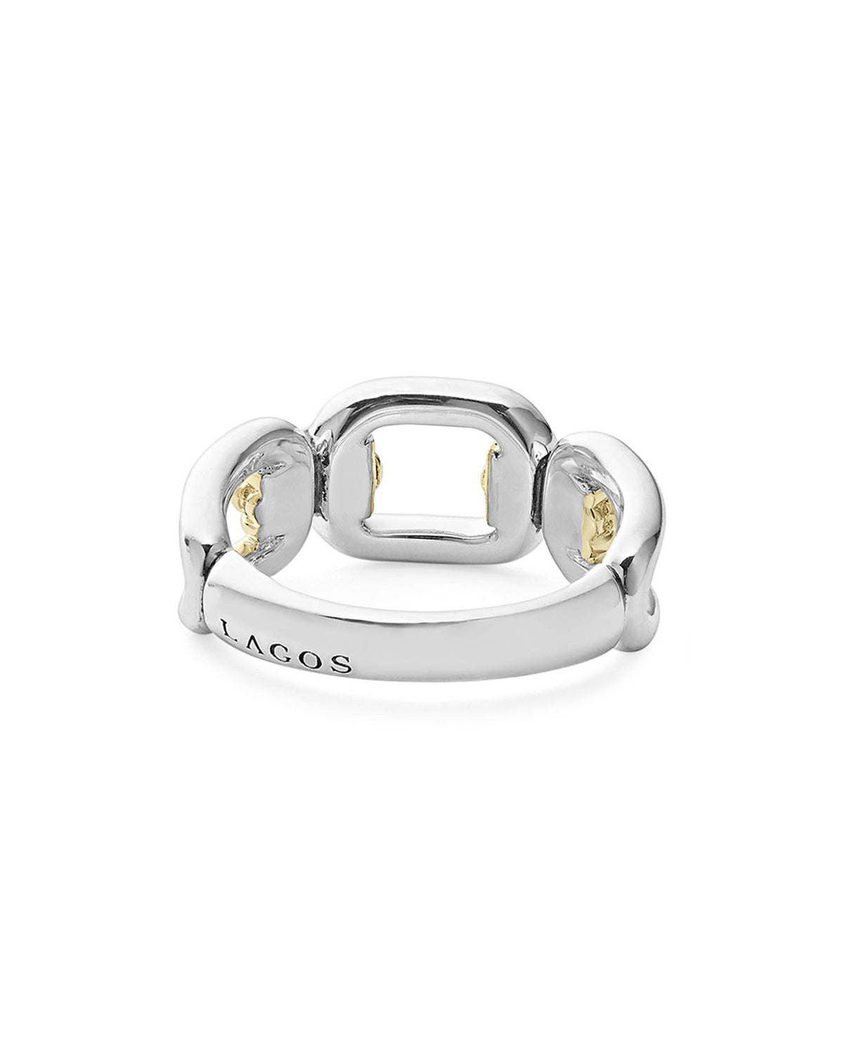 This 18K Yellow & Sterling Silver Signature Caviar Link Ring by LAGOS is a bold addition to the Signature Caviar collection. Featuring sterling silver links accented with 18K yellow gold Caviar beading, this ring exudes contemporary elegance and makes a striking statement.