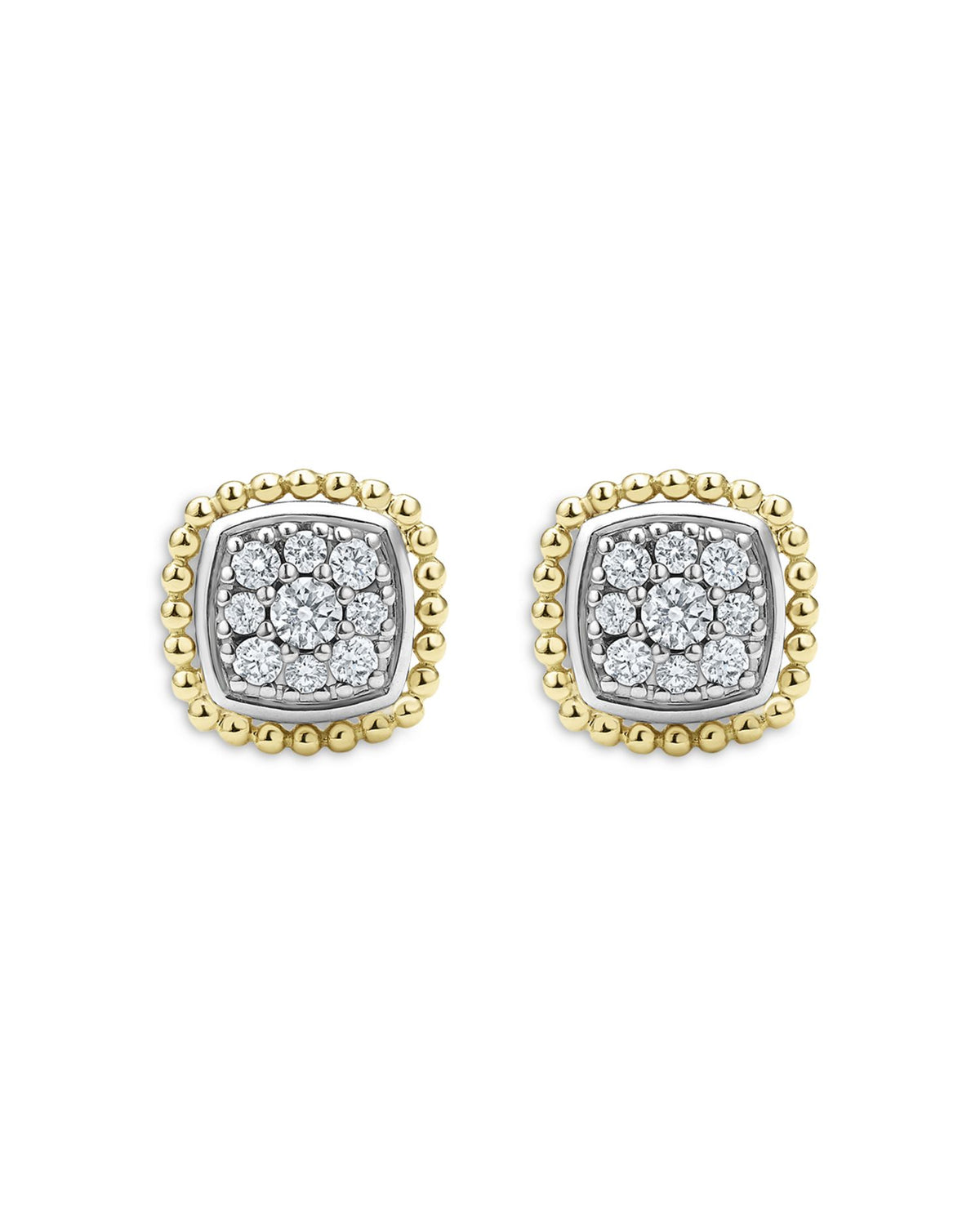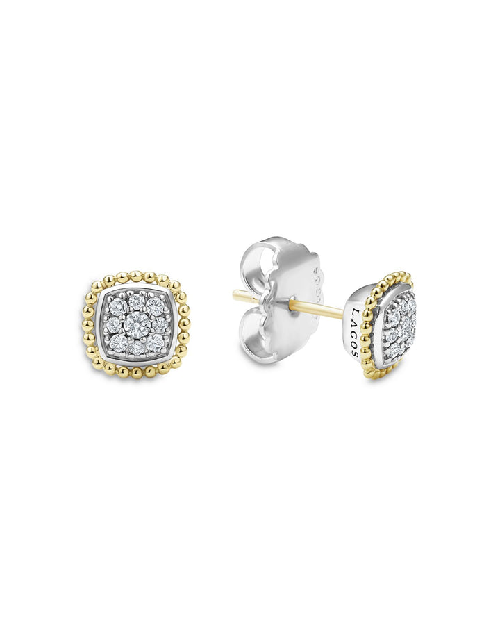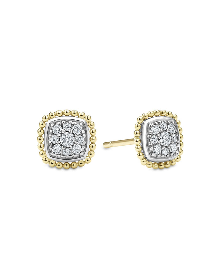 These 18K Yellow Gold & Sterling Silver Rittenhouse Diamond Cluster Stud Earrings by LAGOS are a refined addition to the Rittenhouse collection. Featuring diamond clusters set in sterling silver and outlined in 18K yellow gold, these studs exude elegance and timeless charm.