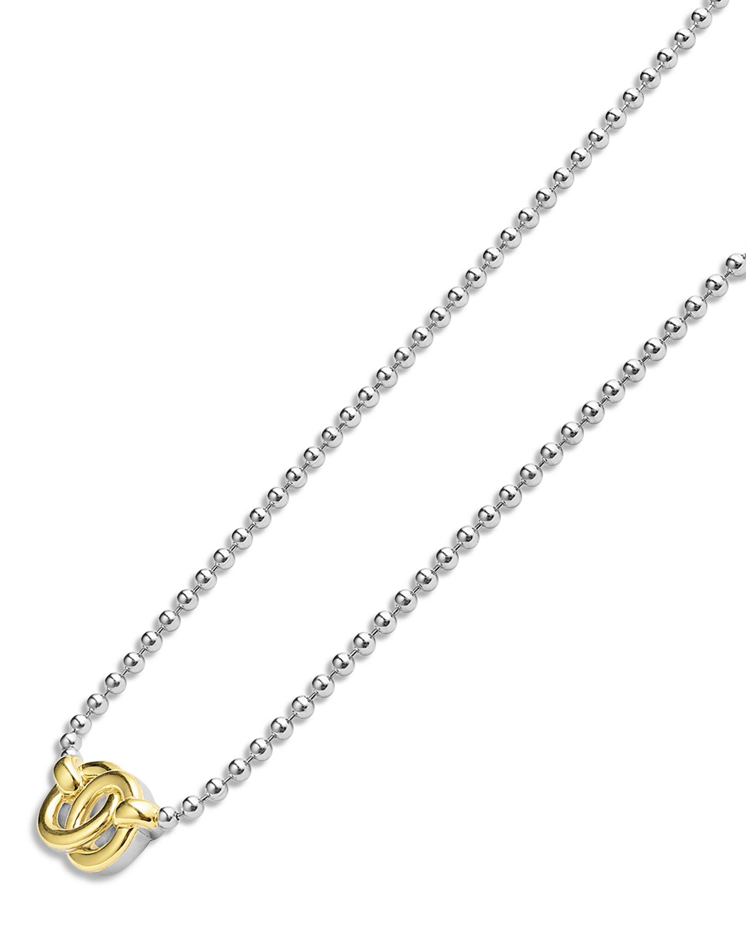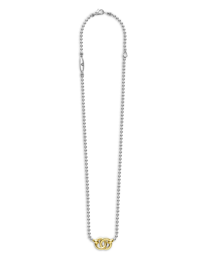This 18K Yellow Gold & Sterling Silver Signature Caviar Interlocking Pendant Necklace by LAGOS is a timeless piece from the Signature Caviar collection. Featuring a two-tone interlocking ring pendant on a beaded chain, this necklace blends style and sophistication, making it perfect for any occasion.