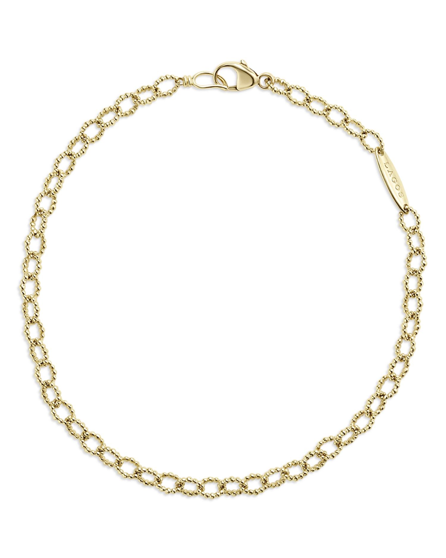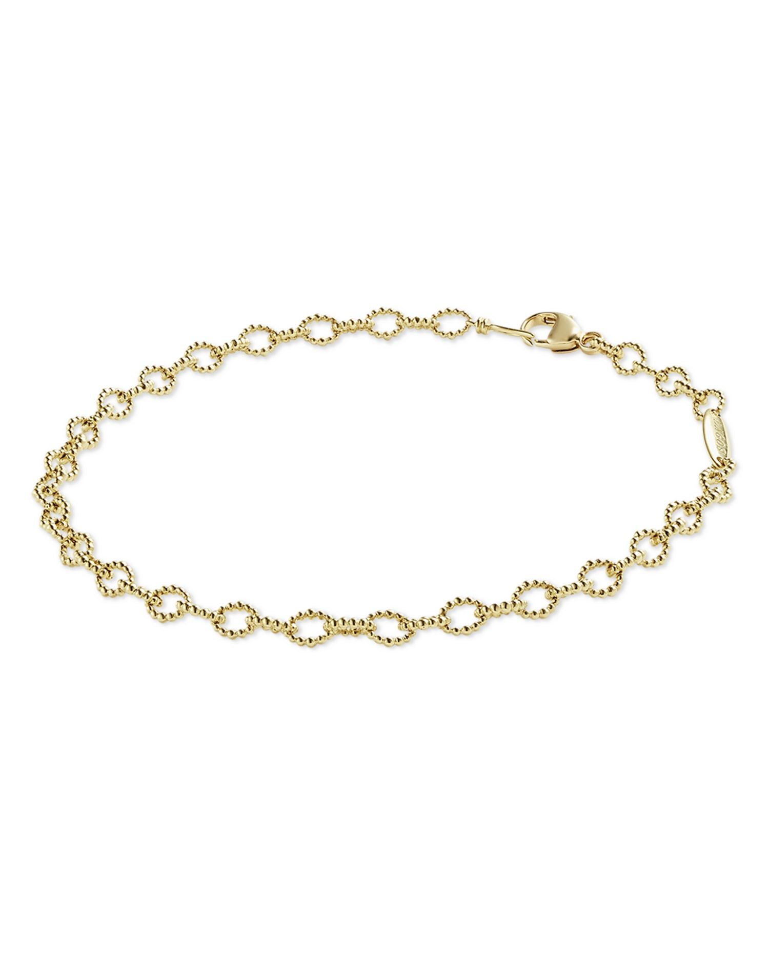 This 18K Yellow Gold Signature Caviar Beaded Oval Link Bracelet by LAGOS exudes exceptional elegance with its radiant caviar beaded oval links. From the Signature Caviar Collection, it offers a refined glow that complements both casual and formal outfits, making it a versatile must-have for jewelry lovers.