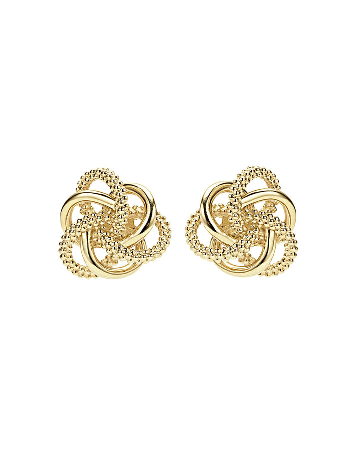 These 18K Gold Love Knot Stud Earrings by LAGOS exude timeless elegance with their gracefully interwoven knot design. Combining smooth and beaded textures, these earrings symbolize unity and love, making them a perfect gift or addition to any jewelry collection.