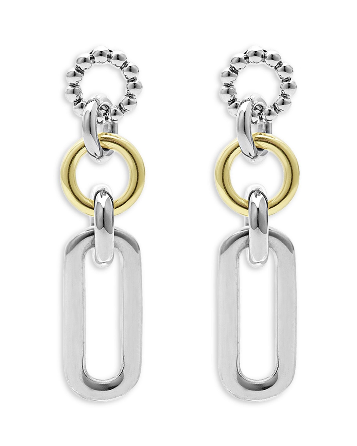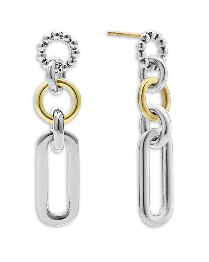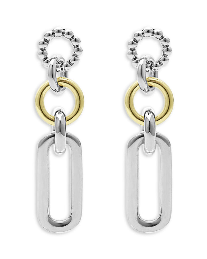 These 18K Yellow & Sterling Silver Signature Caviar Link Drop Earrings by LAGOS are a chic two-tone design from the Signature Caviar Collection. Perfect for adding sophistication to any look, these earrings blend sterling silver links with radiant 18K yellow gold accents.