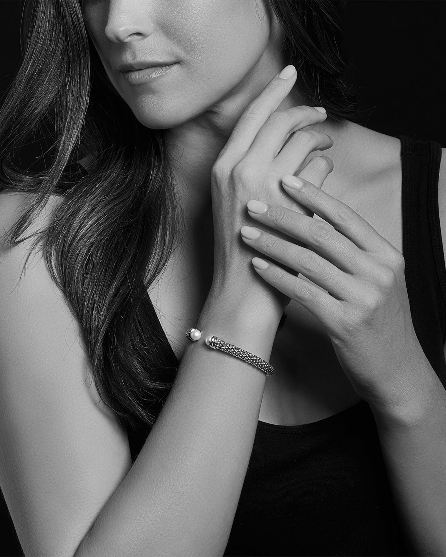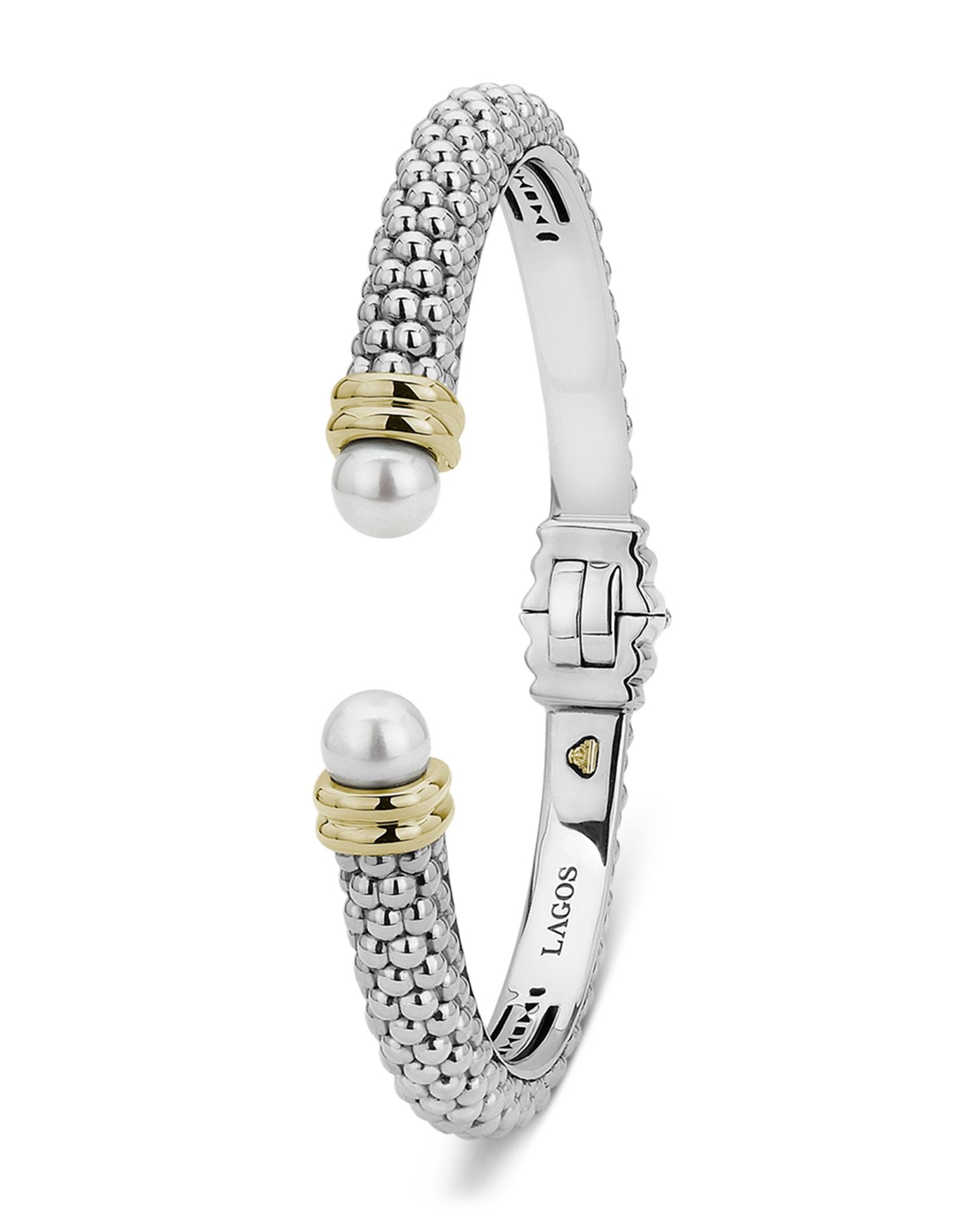 This Sterling Silver and 18K Yellow Gold Luna Cultured Freshwater Pearl Cuff by LAGOS exudes timeless elegance. Featuring silver Caviar beading and luminous pearl endcaps, this hinged cuff from the Luna Collection is the perfect blend of classic sophistication and modern craftsmanship.