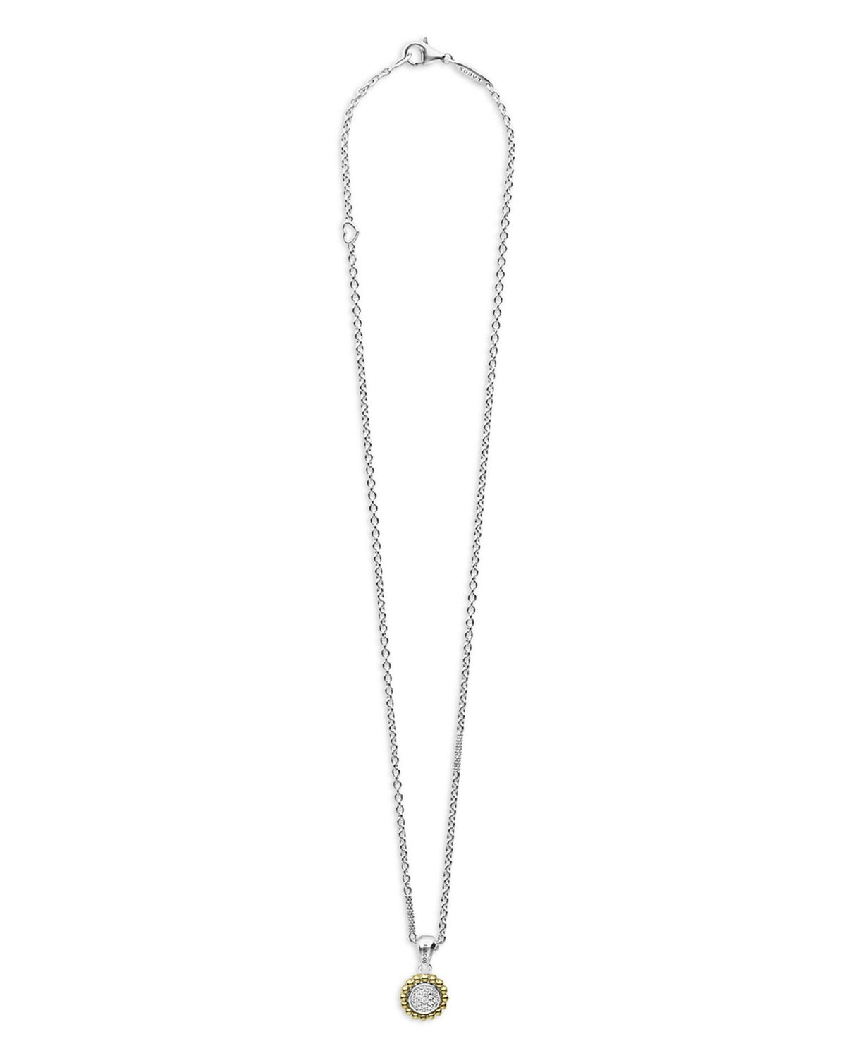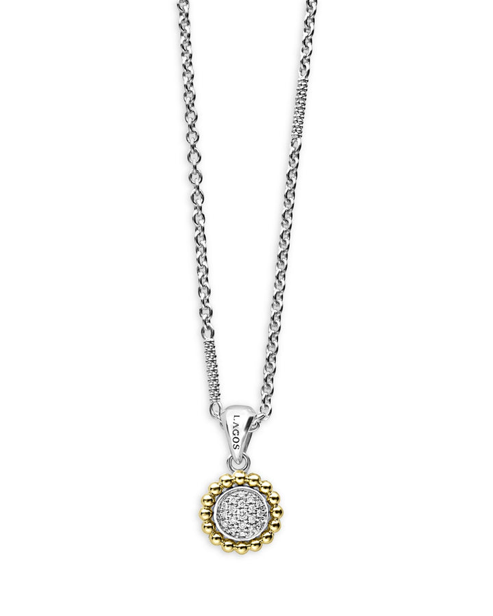 This 18K Yellow Gold & Sterling Silver Diamond Cluster Bead Frame Pendant Necklace by LAGOS features a shimmering diamond cluster framed by polished gold beads. This elegant pendant necklace is perfect for adding a touch of sparkle to everyday or formal looks.