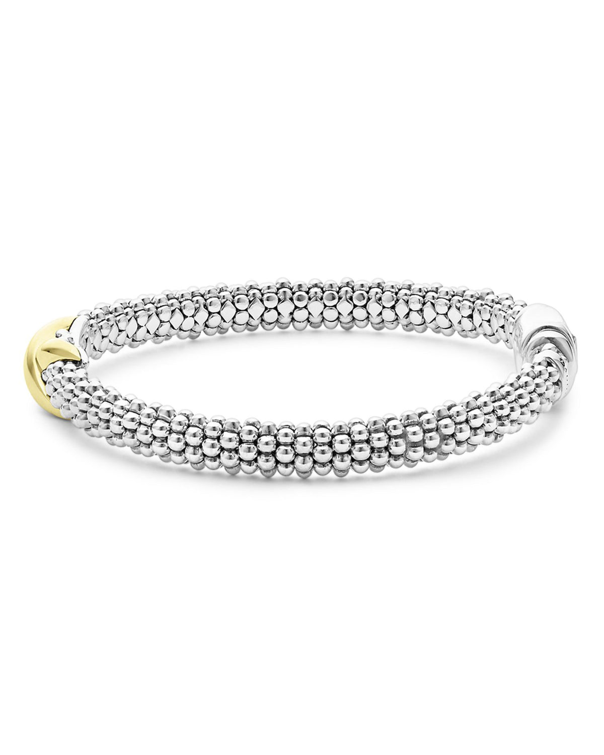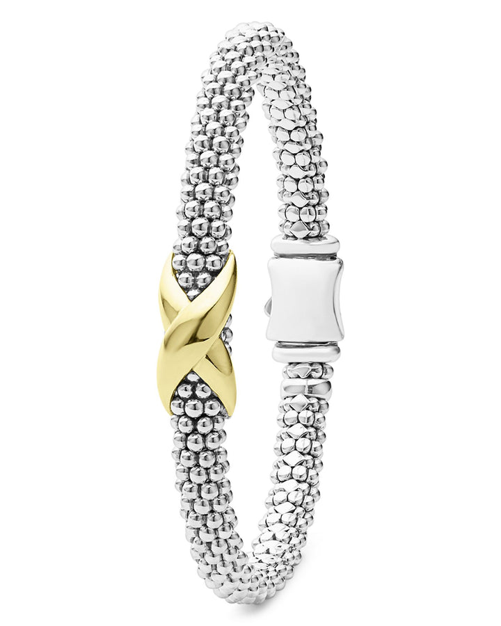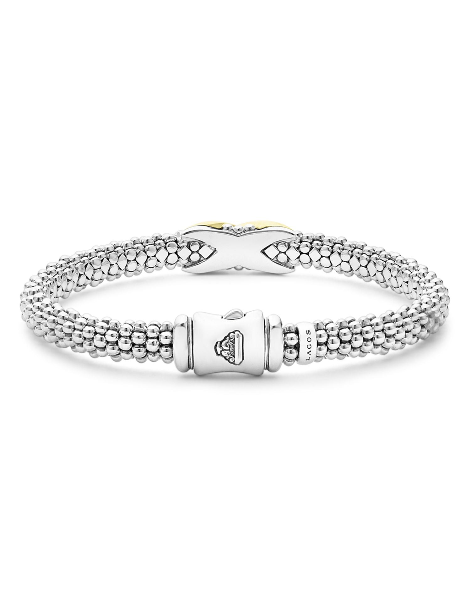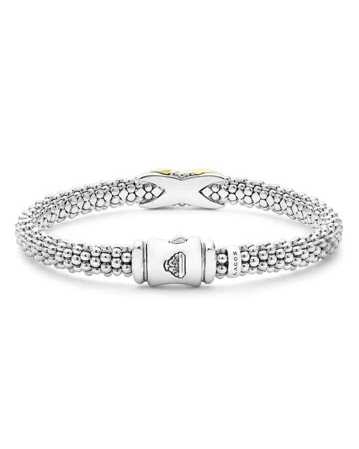 This 18K Yellow Gold & Sterling Silver Embrace X Caviar Bead Link Bracelet by LAGOS showcases a polished gold "X" accent against sterling silver Caviar beads. From the Embrace Collection, this two-tone bracelet is a symbol of connection and style.