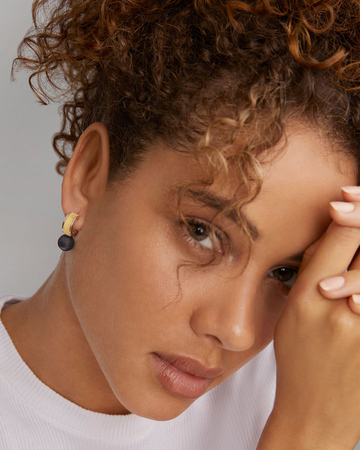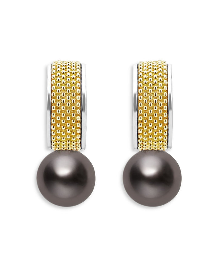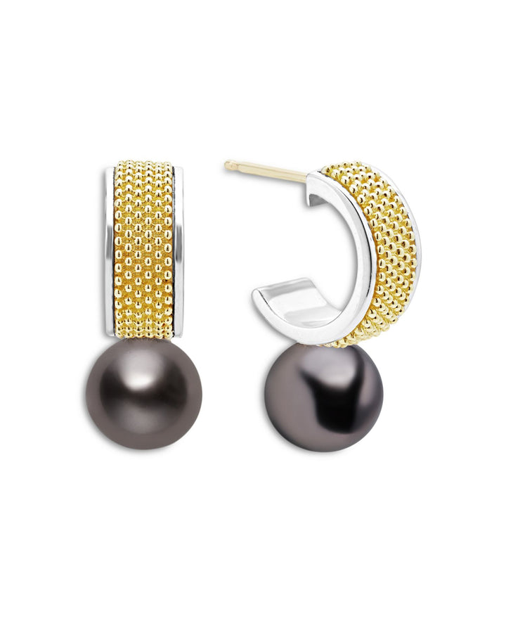 These 18K Yellow Gold & Sterling Silver Luna Black Tahitian Pearl Half Hoop Earrings by LAGOS exude sophistication and modern elegance. Yellow gold and sterling silver Caviar beading beautifully frame the luxurious 9mm black Tahitian pearl drop detailing. From the Luna Collection, these half hoop earrings are perfect for elevating any look.