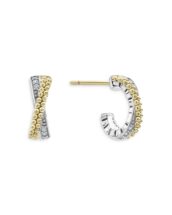 These Sterling Silver & 18K Yellow Gold Caviar Lux Diamond Hoop Earrings by LAGOS exude understated luxury with sparkling diamonds and gold Caviar beading. From the Caviar Lux Collection, these crossover hoops are a versatile addition to any jewelry collection.