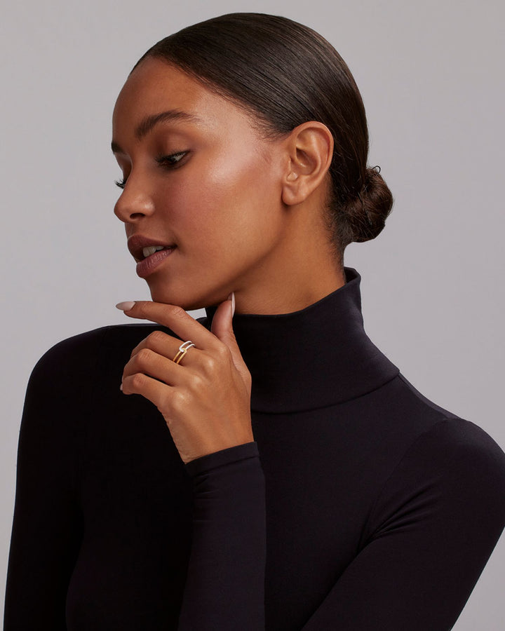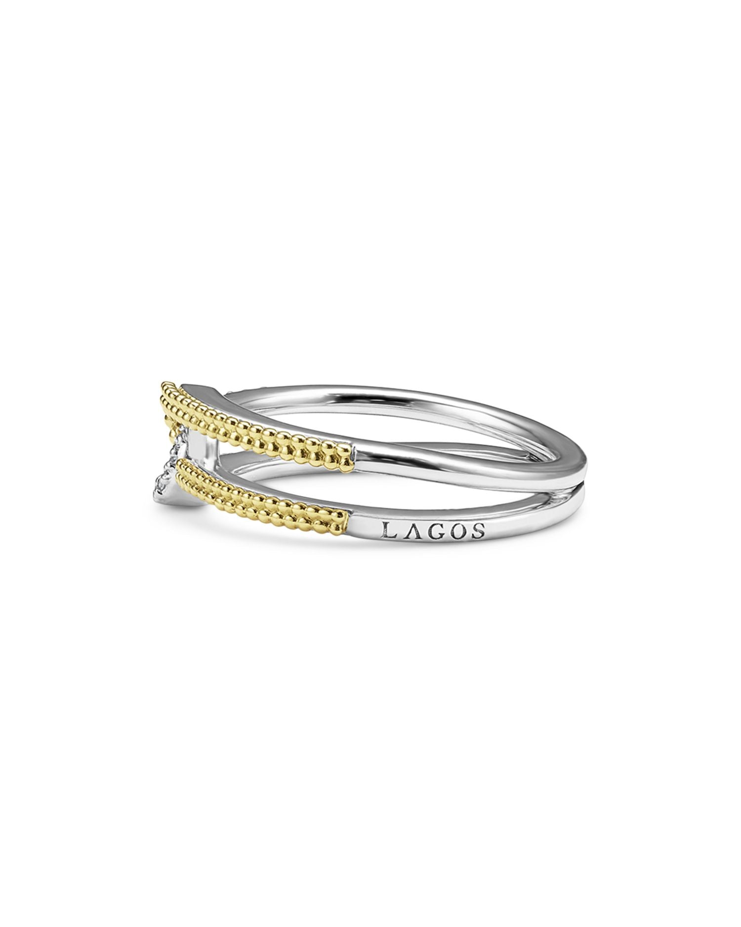 This 18K Yellow Gold & Sterling Silver Caviar Lux-Clip Diamond Small Statement Ring by LAGOS features a unique two-tone design with intertwined diamond accents, offering a bold and modern look. From the Caviar Lux-Clip Collection, this ring is perfect for making a striking style statement.