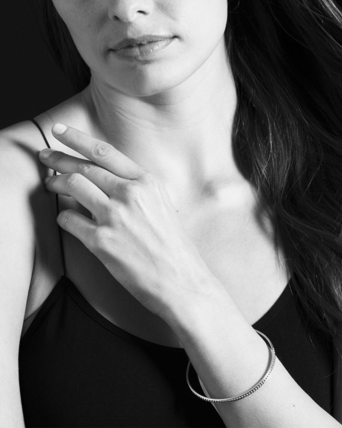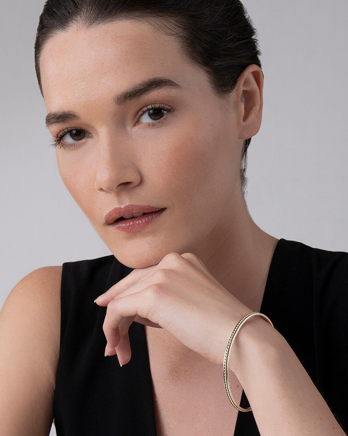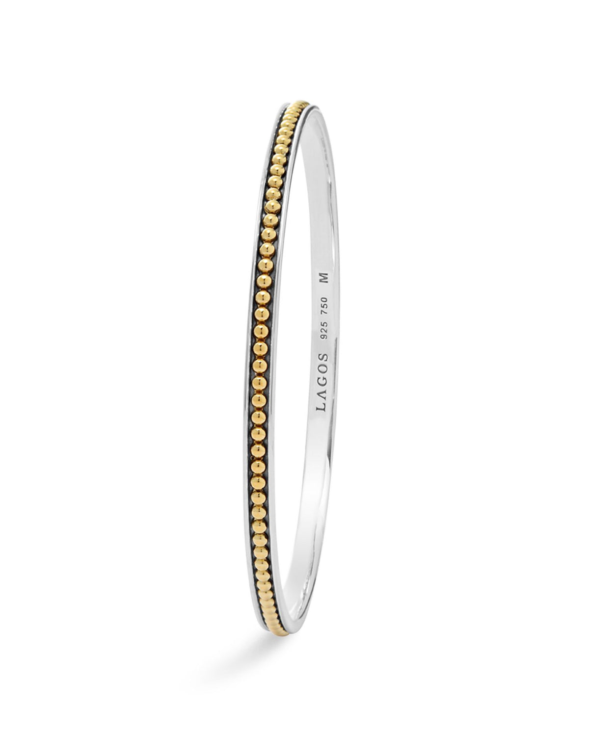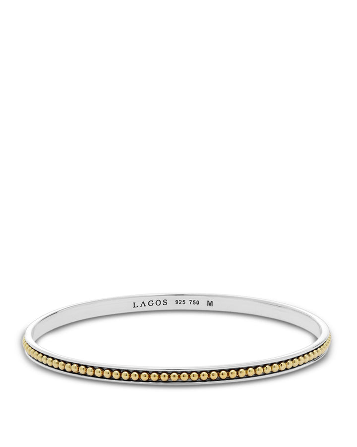 This LAGOS 18K Green Gold and Sterling Silver Enso Bangle Bracelet is a slim and sophisticated piece featuring a bead motif that combines sterling silver and yellow gold. Designed for versatility, it can be worn solo or stacked for a chic, layered look.