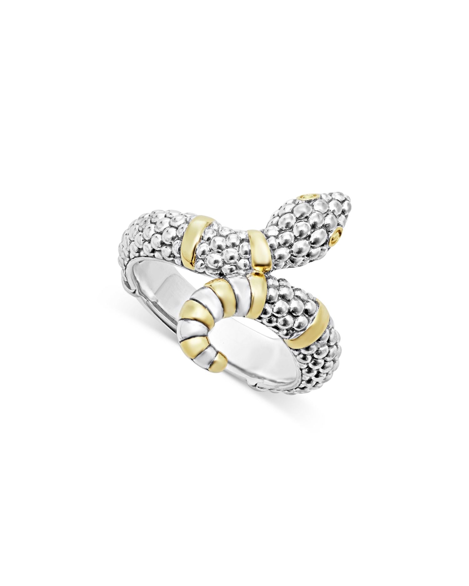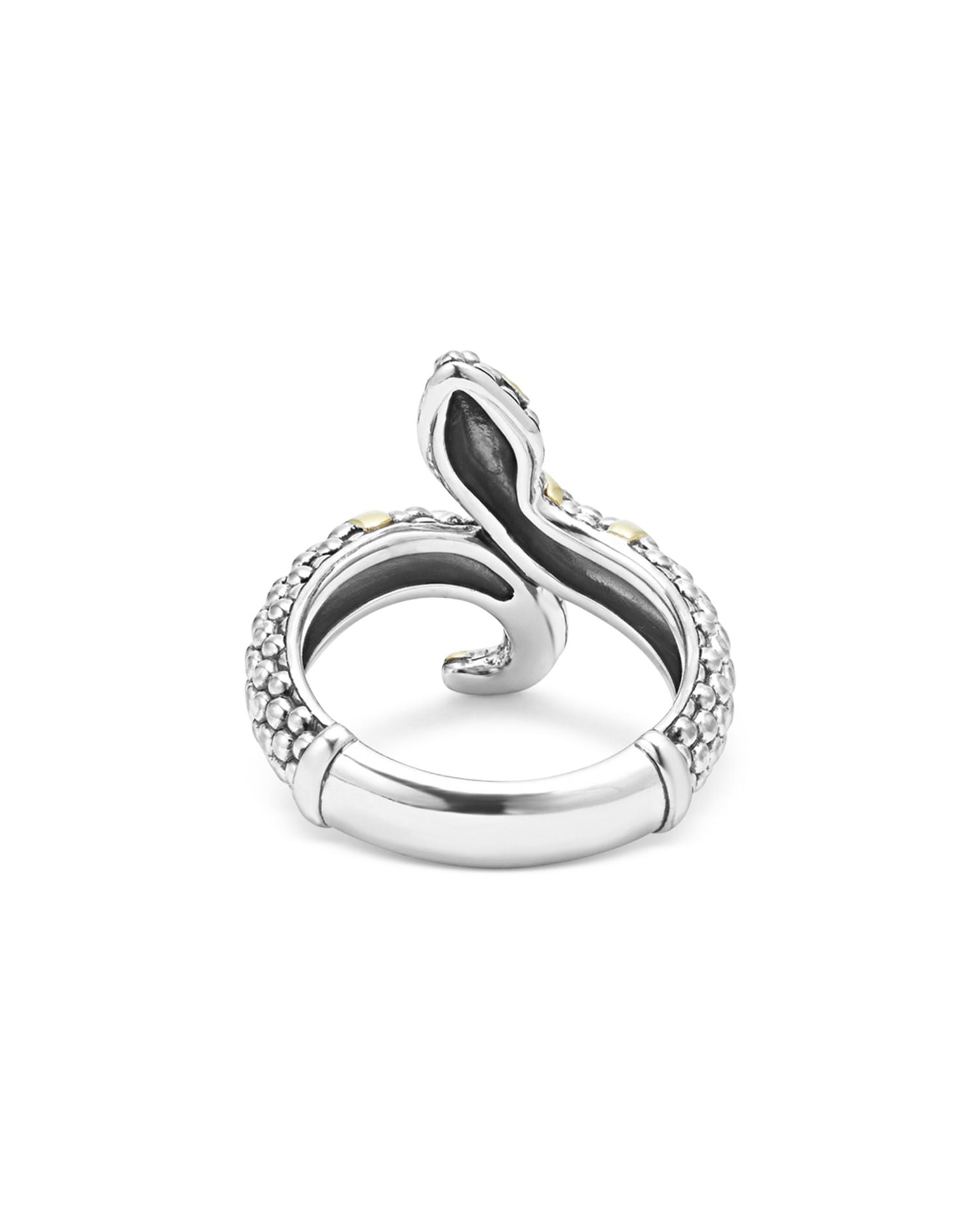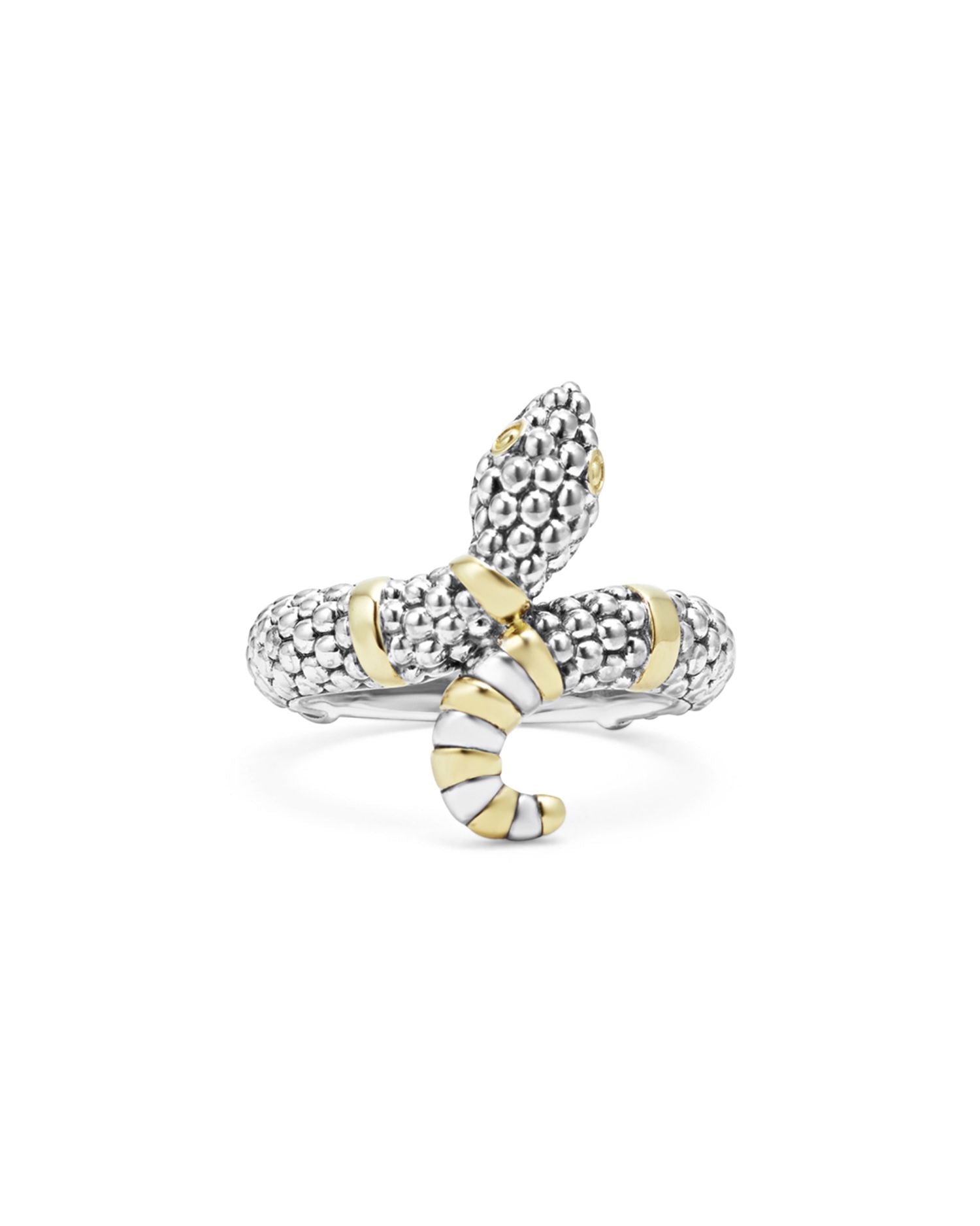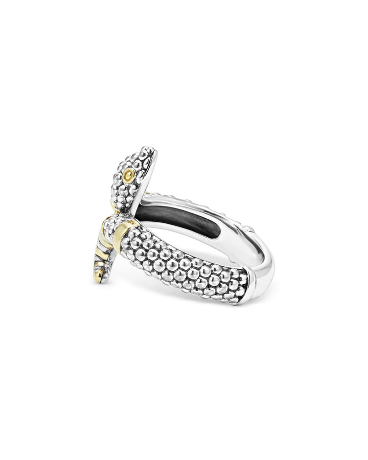 This 18K Yellow Gold & Sterling Silver Rare Wonders Caviar Bead Snake Ring by LAGOS embodies exotic sophistication. With its unique two-tone snake design, silver Caviar beading, and 18K gold accents, this statement ring from the Rare Wonders Collection is a bold addition to any jewelry collection.