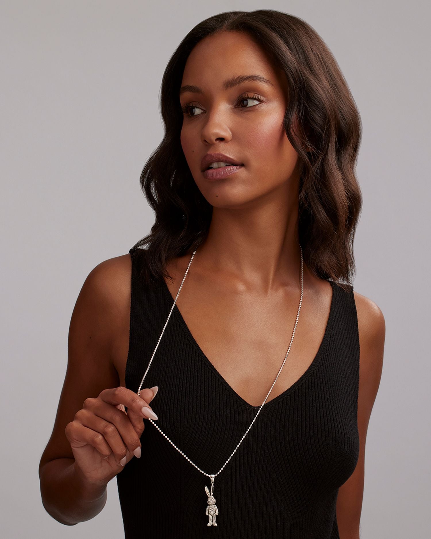 This Sterling Silver Rare Wonders Karat Rabbit Pendant Necklace by LAGOS is a whimsical and enchanting design from the Rare Wonders Collection. Featuring a movable, intricately beaded rabbit pendant, this playful yet elegant necklace is perfect for adding a unique touch to any outfit.