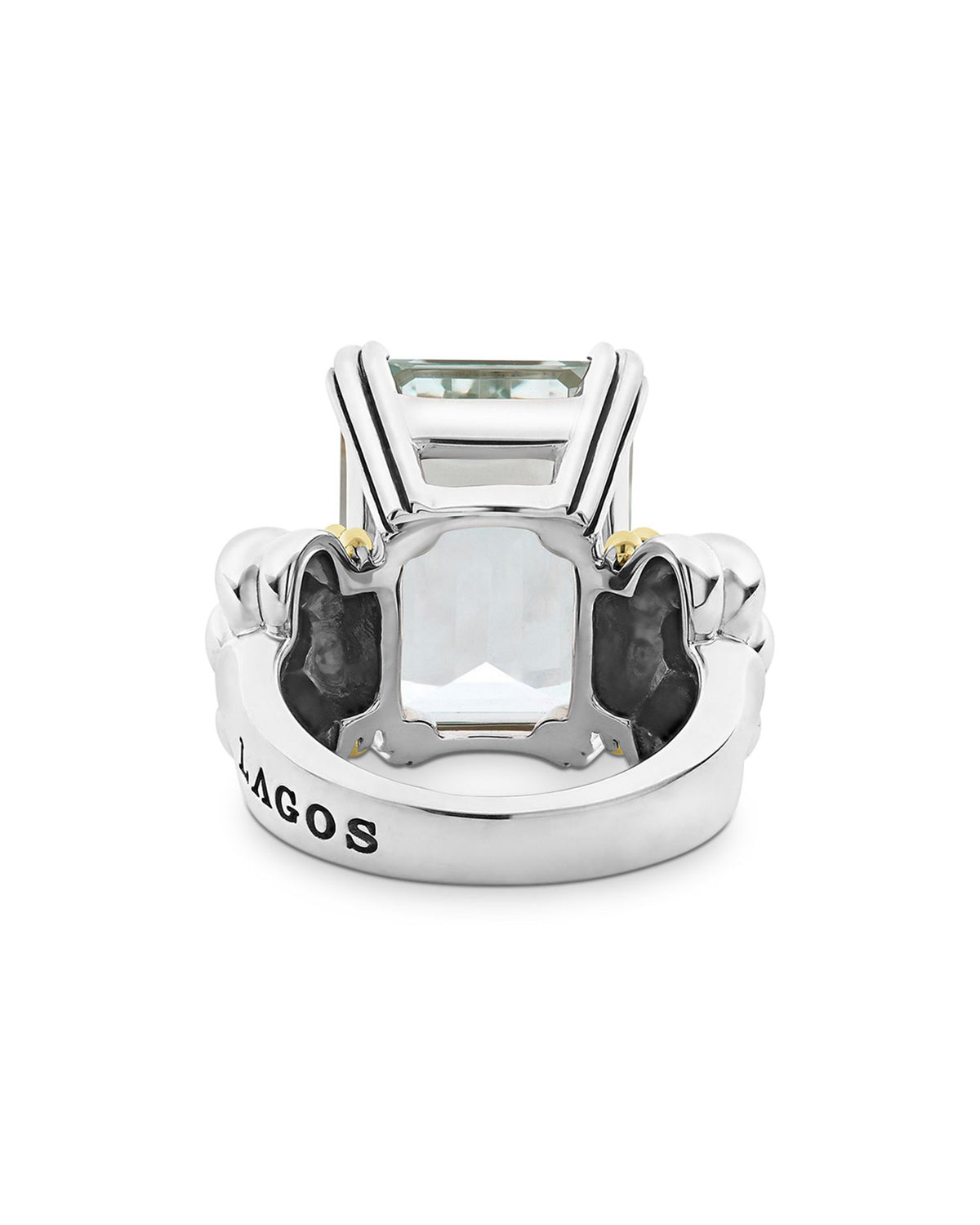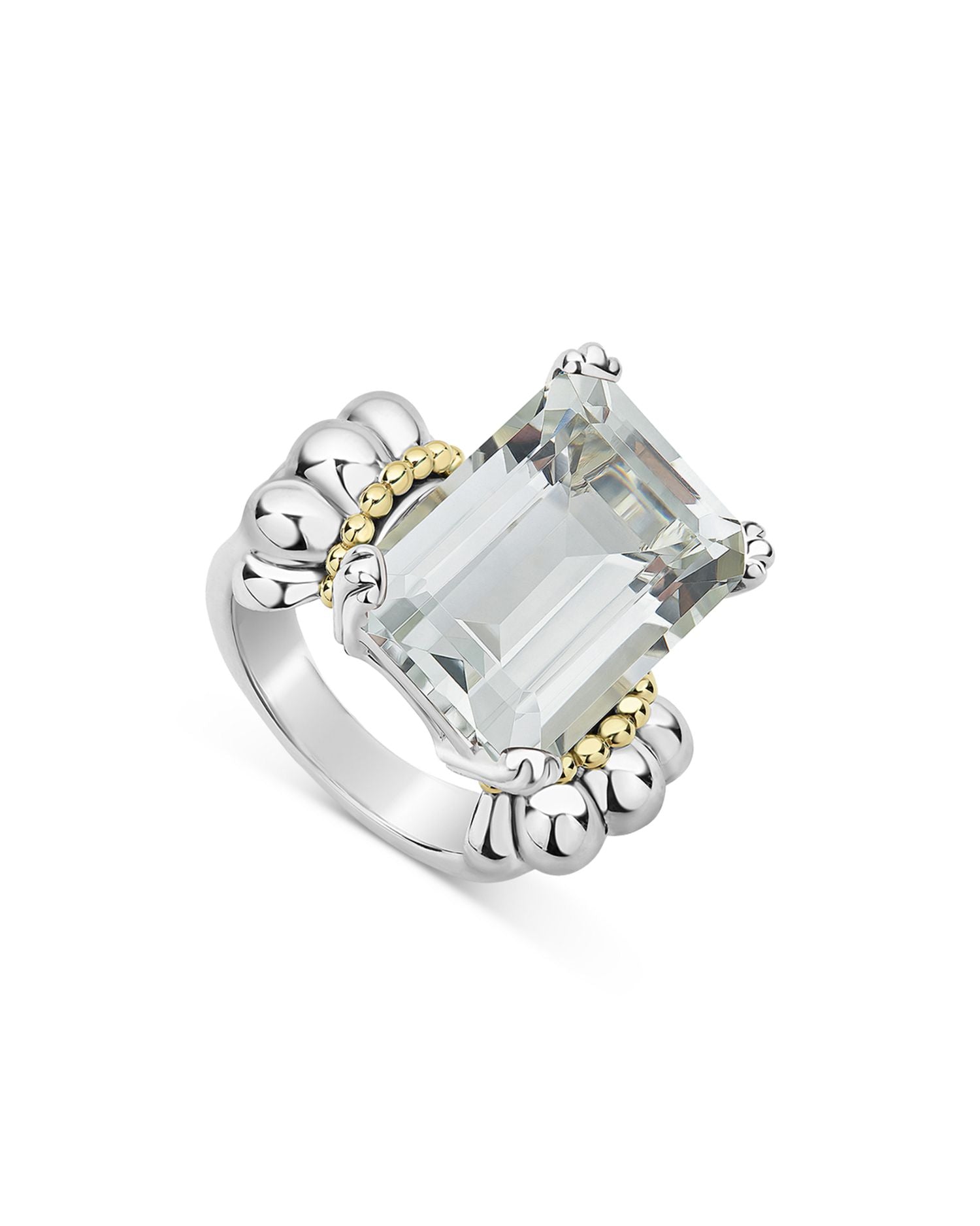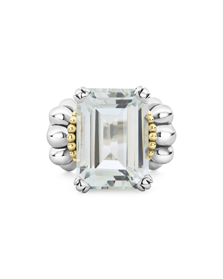 This Sterling Silver & 18K Yellow Gold Glacier White Topaz Ring by LAGOS features a stunning emerald-cut white topaz gemstone, secured in a classic prong setting. Accented with gold Caviar beading, this piece from the Glacier Collection is a timeless and elegant addition to any jewelry collection.