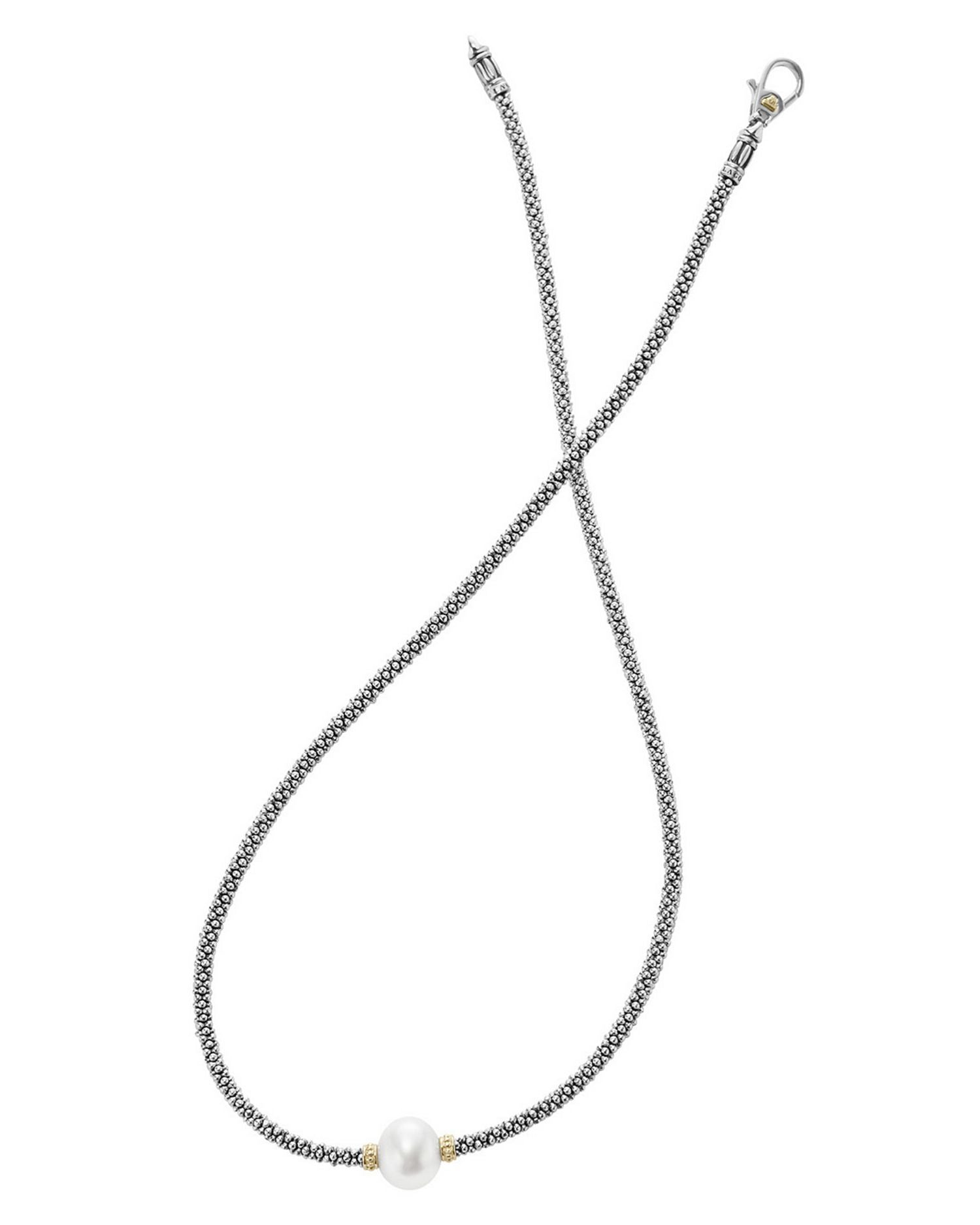 This 18K Gold and Sterling Silver Luna Rope Necklace with Cultured Freshwater Pearl by LAGOS is a refined and timeless design. Featuring a luminous 9mm cultured freshwater pearl framed by 18K gold and sterling silver Caviar beading, it’s a sophisticated piece perfect for elevating any outfit. Finished with a signature LAGOS crest lobster clasp.