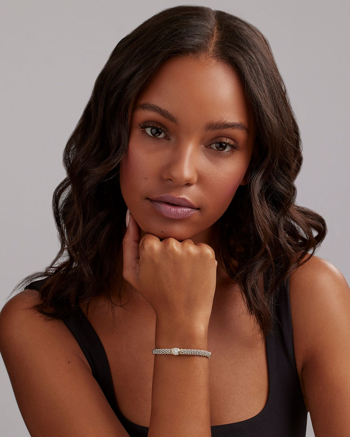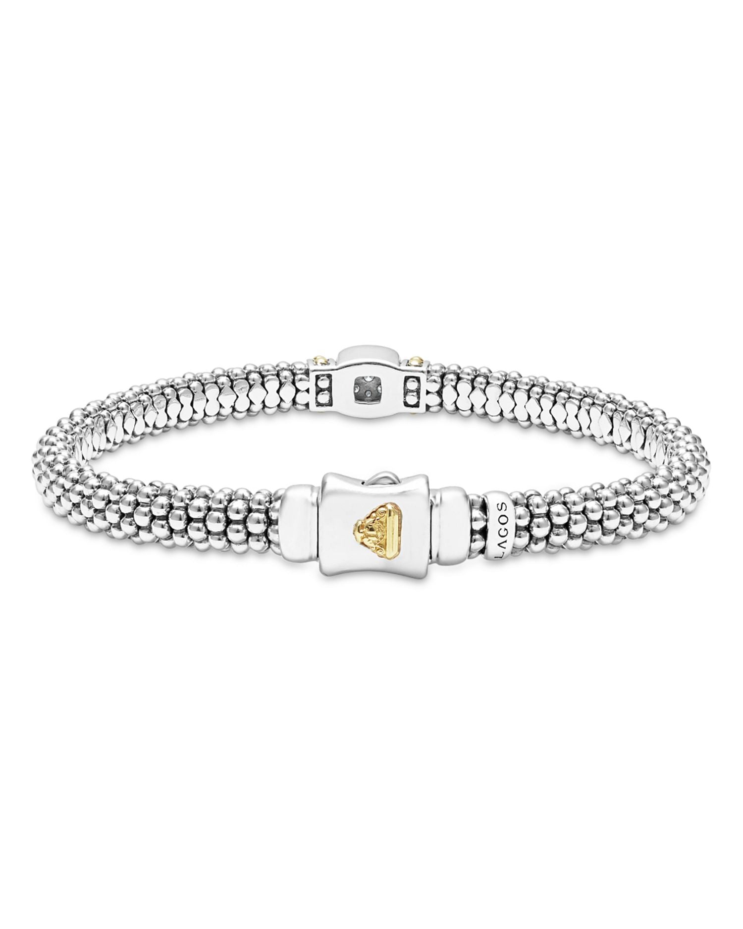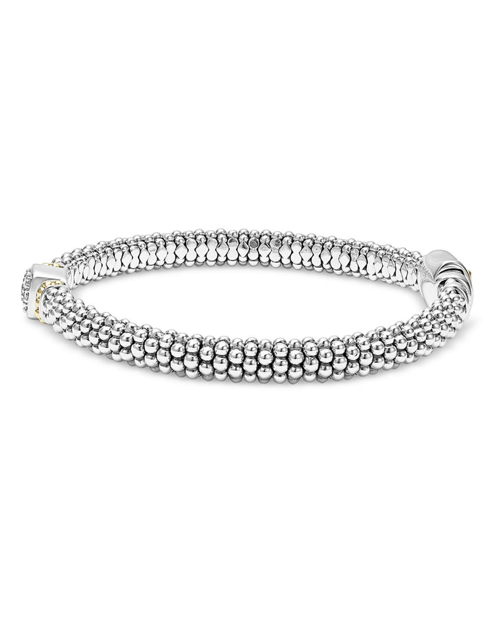 This 18K Yellow Gold & Sterling Silver Rittenhouse Diamond Cluster Caviar Rope Bead Bracelet by LAGOS combines a sparkling diamond cluster with Caviar rope beading for an elegant and luxurious look. Accented with 18K yellow gold, this bracelet from the Rittenhouse Collection is ideal for adding understated glamour to your style.