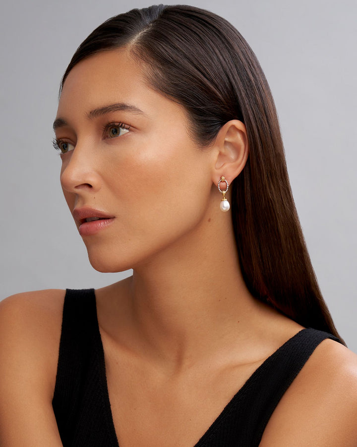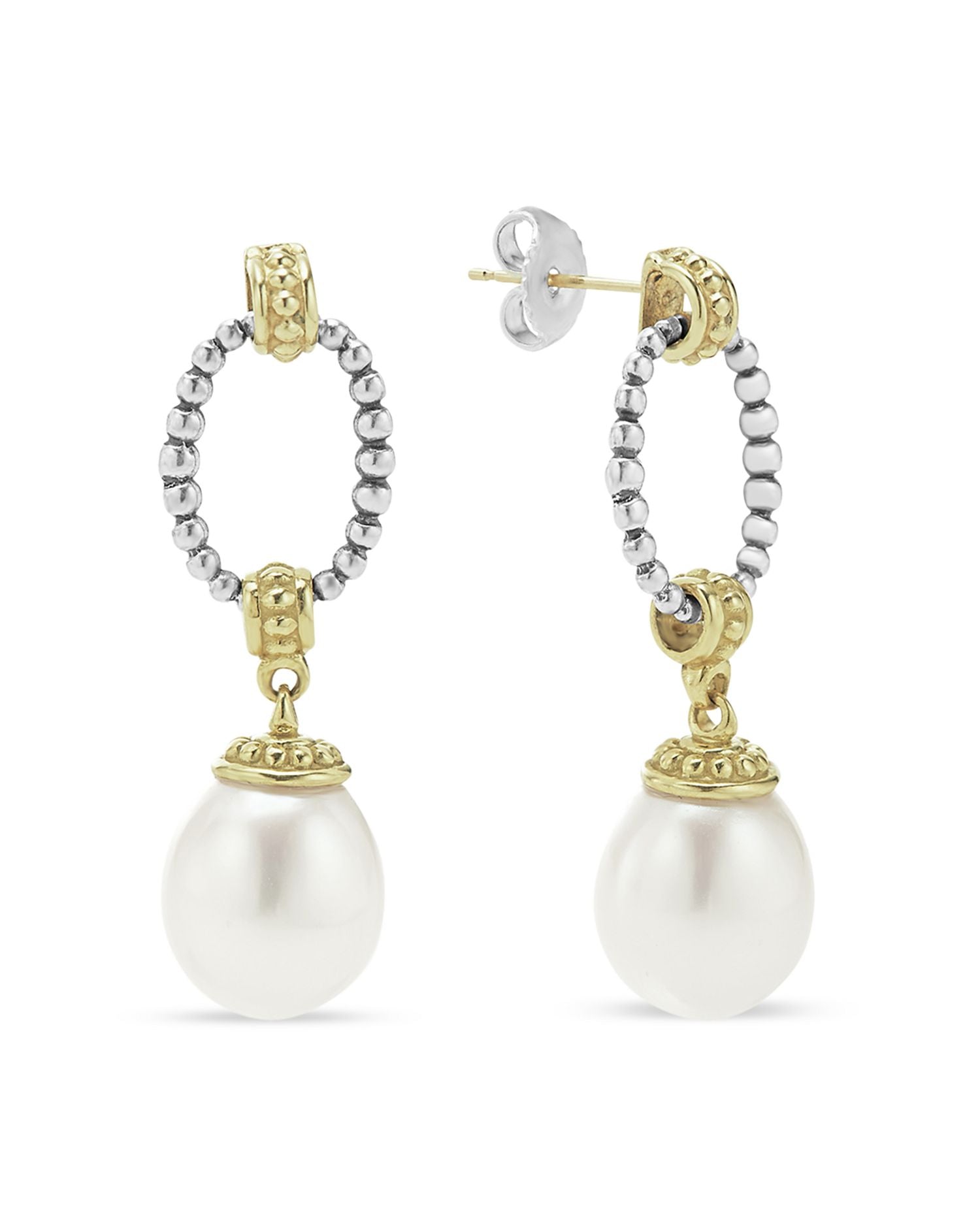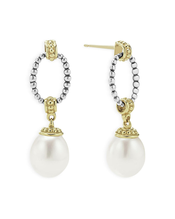 These 18K Gold & Sterling Silver Two Tone Cultured Pearl Oval Drop Earrings by LAGOS are an exquisite design featuring 9mm cultured pearls suspended from Caviar beaded posts. From the Luna Collection, these earrings combine classic elegance with a modern twist.