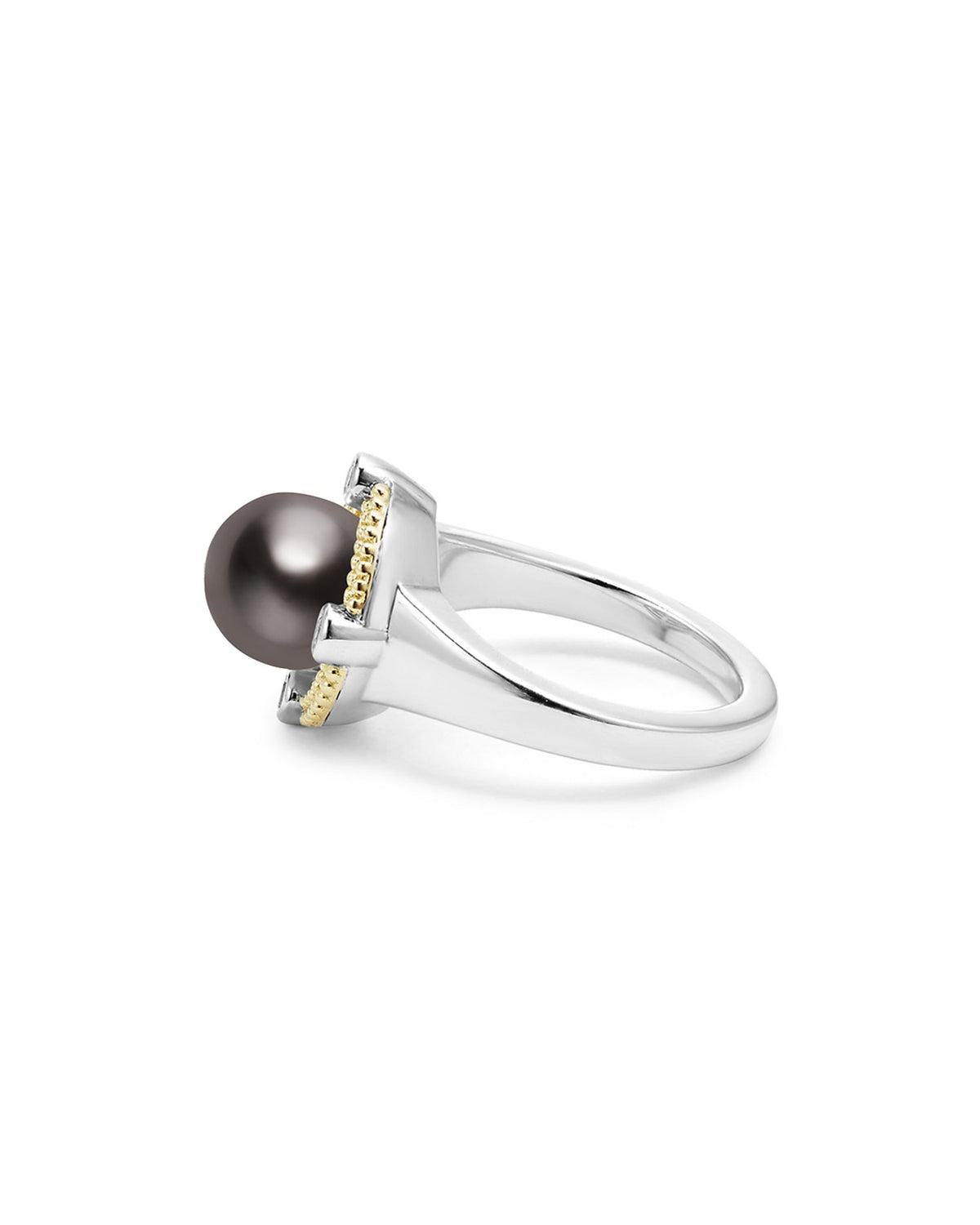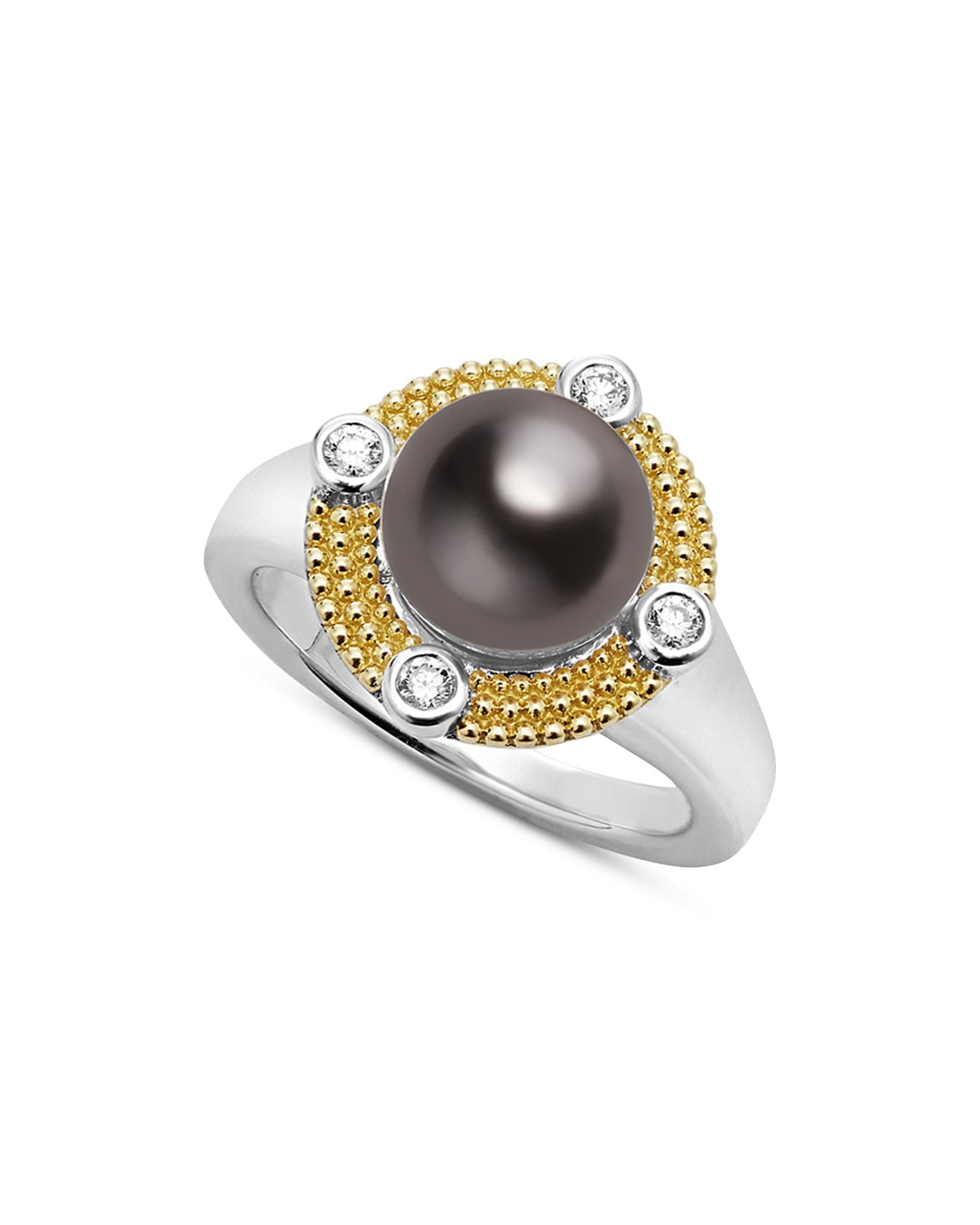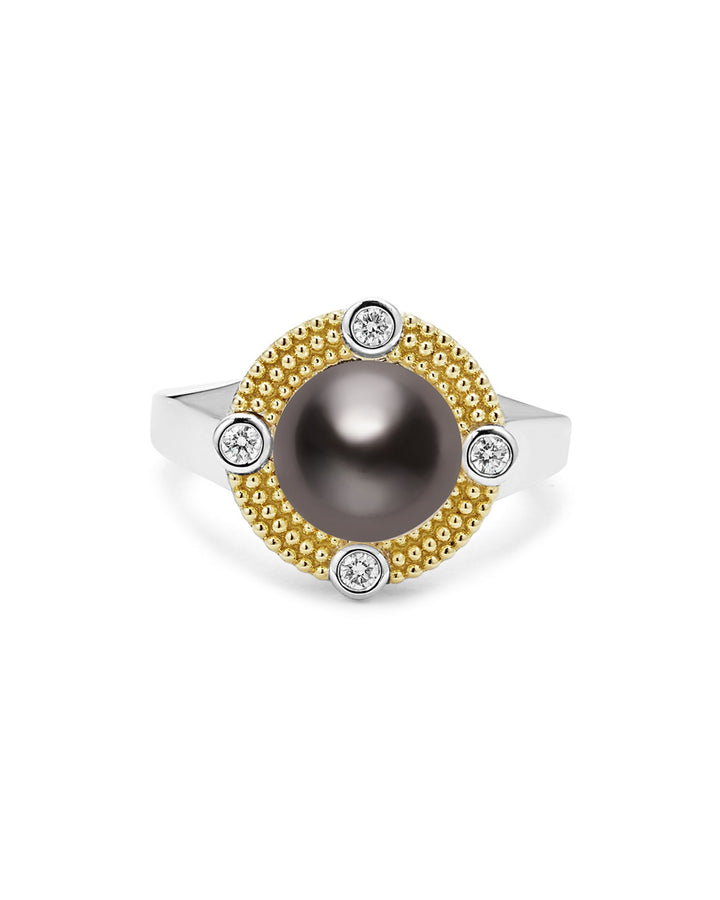 This 18K Yellow Gold & Sterling Silver Luna Black Tahitian Pearl & Diamond Halo Ring by LAGOS is a sophisticated design featuring a luminous 9mm black Tahitian pearl, embraced by bezel-set diamonds and intricate Caviar beading. From the Luna Collection, it’s a statement of elegance.