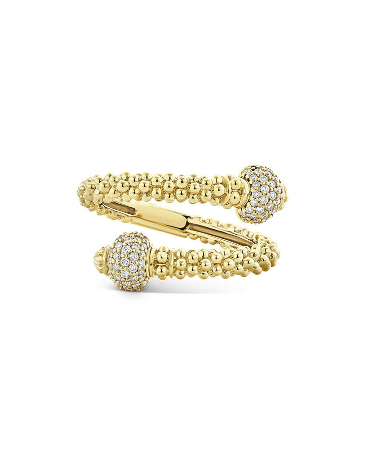This 18K Yellow Gold Bypass Ring with Diamonds by LAGOS is a modern and elegant wrap ring design featuring sparkling diamonds set in luxurious 18K gold. Its unique silhouette makes it a standout piece for everyday or special occasions.
