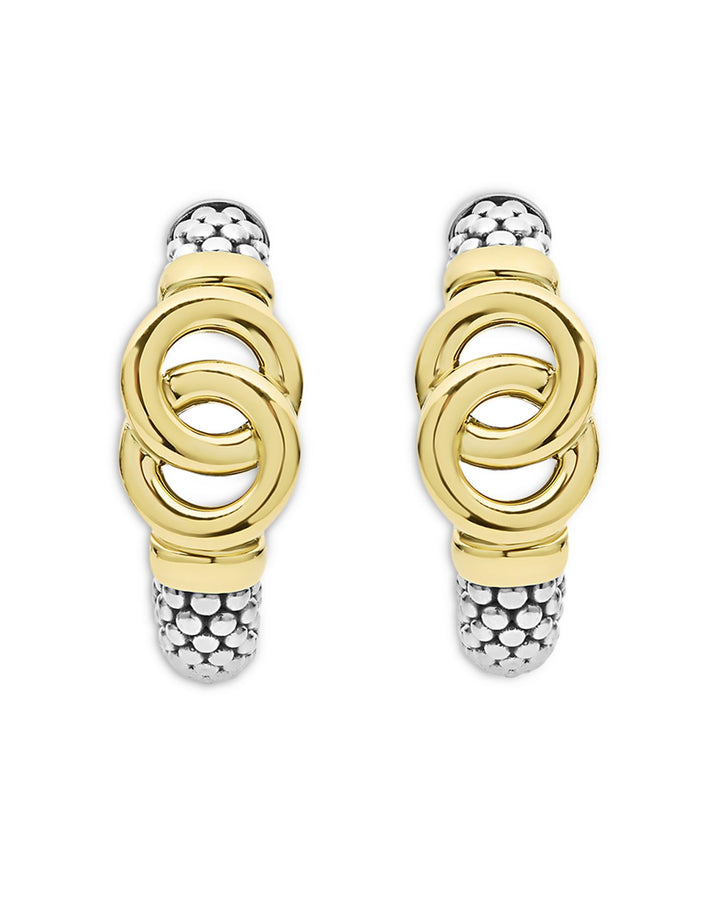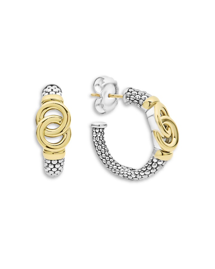 These 14K & 18K Yellow Gold & Sterling Silver Signature Caviar Interlocking Small Hoop Earrings by LAGOS combine modern style with classic elements. Featuring Caviar beaded sterling silver hoops with contrasting 18K gold interlocking rings, these earrings from the Signature Caviar Collection make a bold yet refined statement.