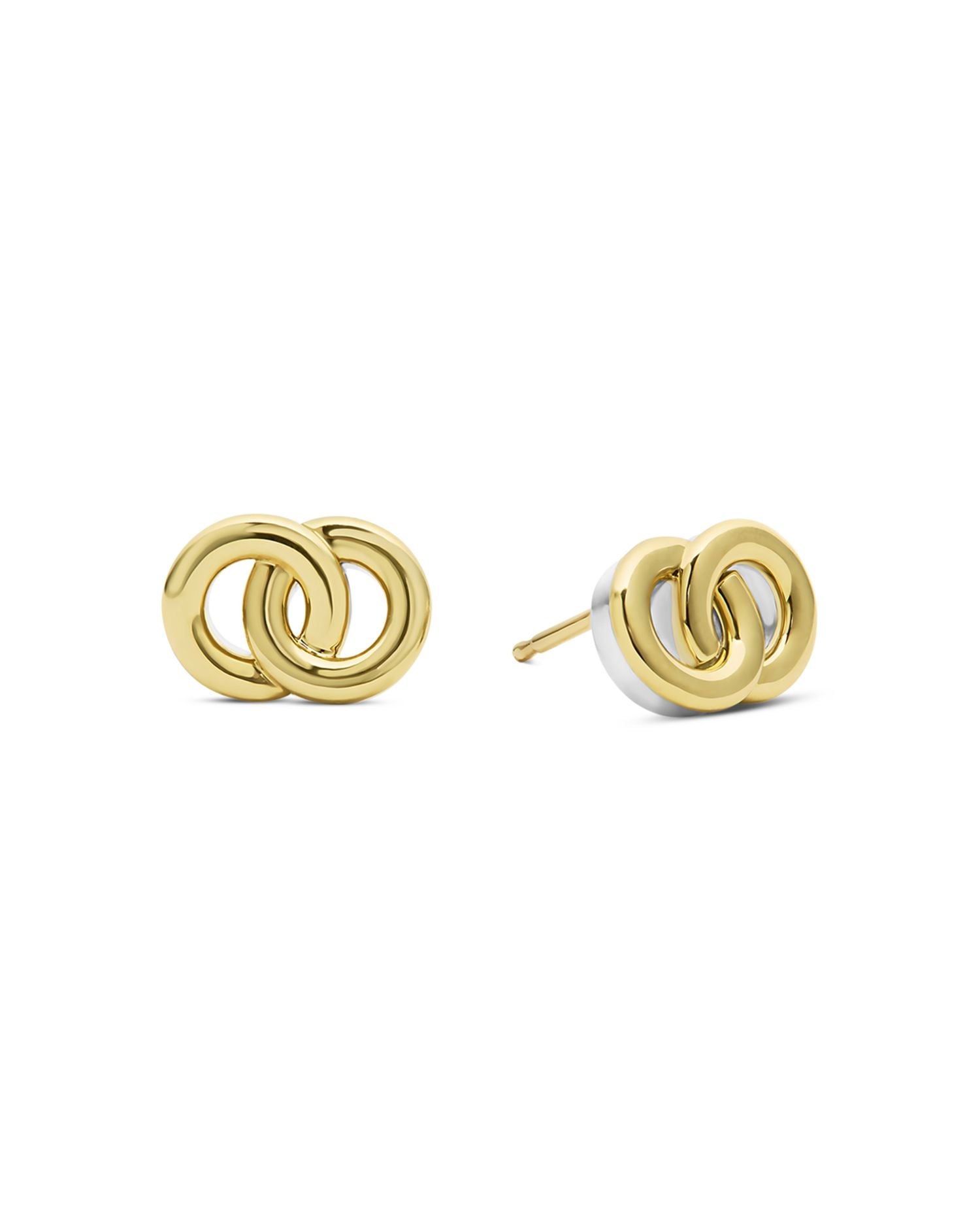 These 14K & 18K Yellow Gold & Sterling Silver Signature Caviar Interlocking Stud Earrings by LAGOS are chic and contemporary. Featuring a two-tone design with interlocking silver and yellow gold elements, they’re a versatile and sophisticated accessory from the Signature Caviar Collection.
