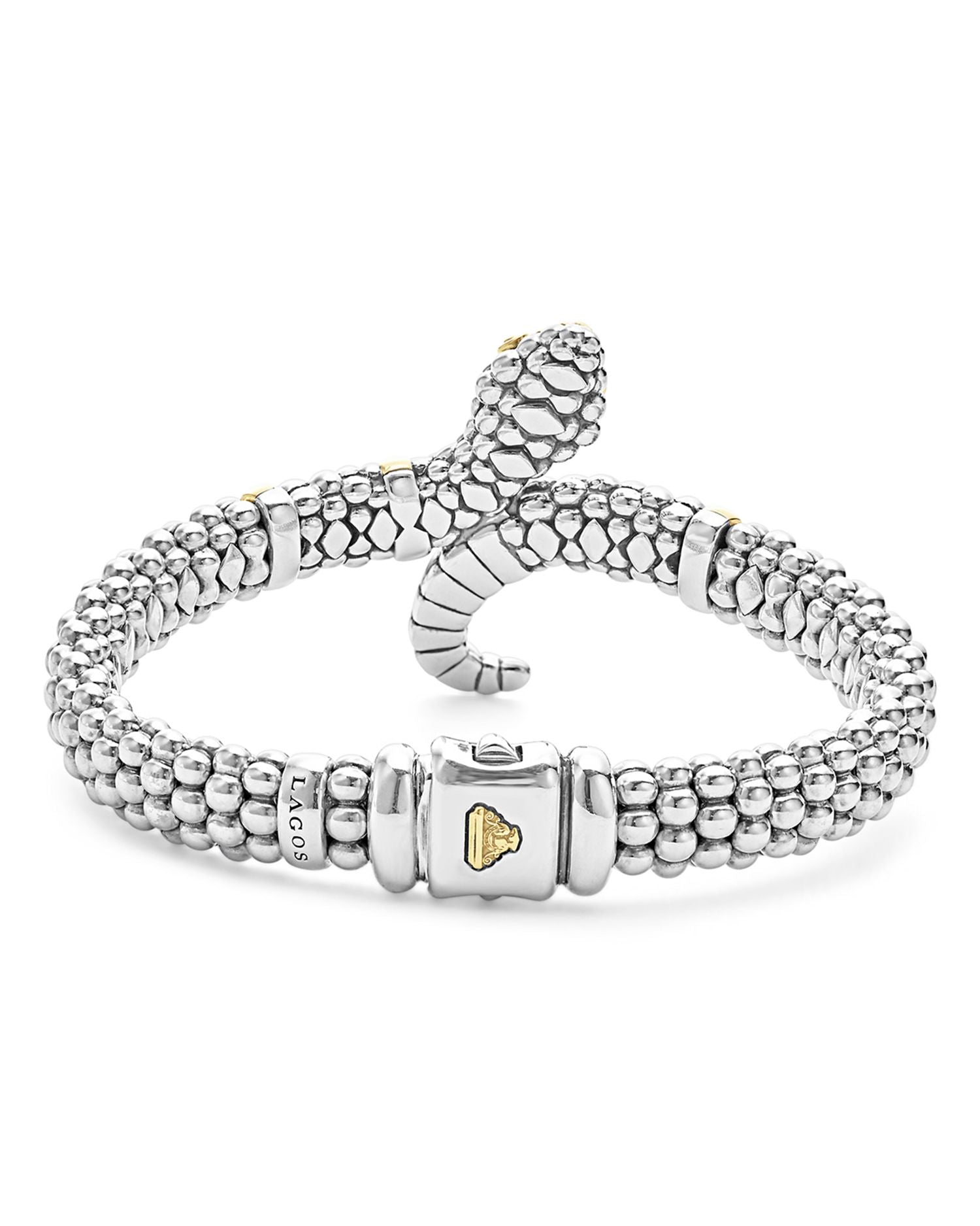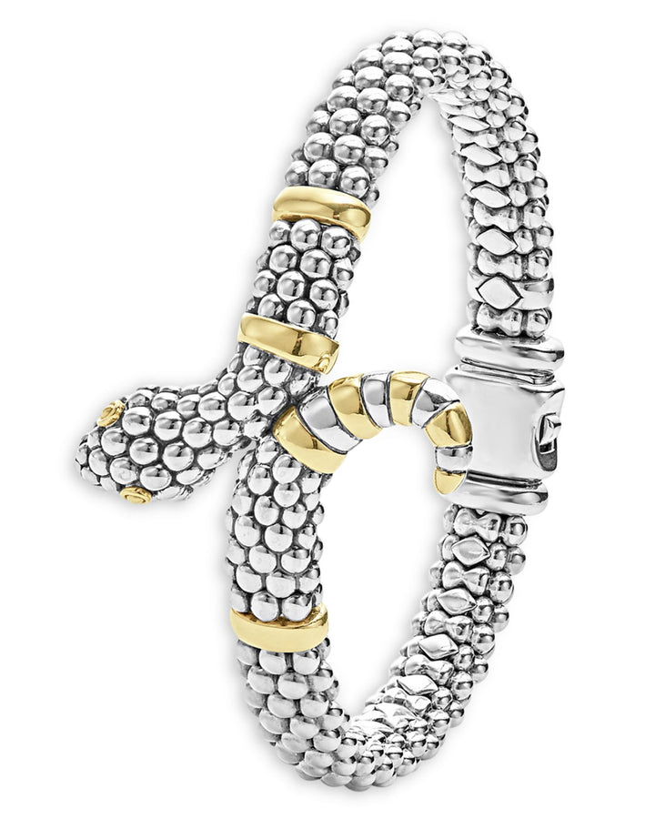 This 18K Yellow Gold & Sterling Silver Rare Wonders Caviar Bead Snake Bracelet by LAGOS brings a daring and exotic touch to your jewelry collection. Featuring a snake-inspired design with intricate silver Caviar beading and 18K gold accents, this bracelet is a striking statement piece.