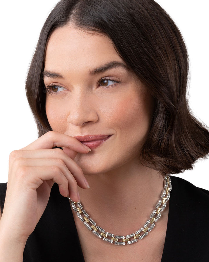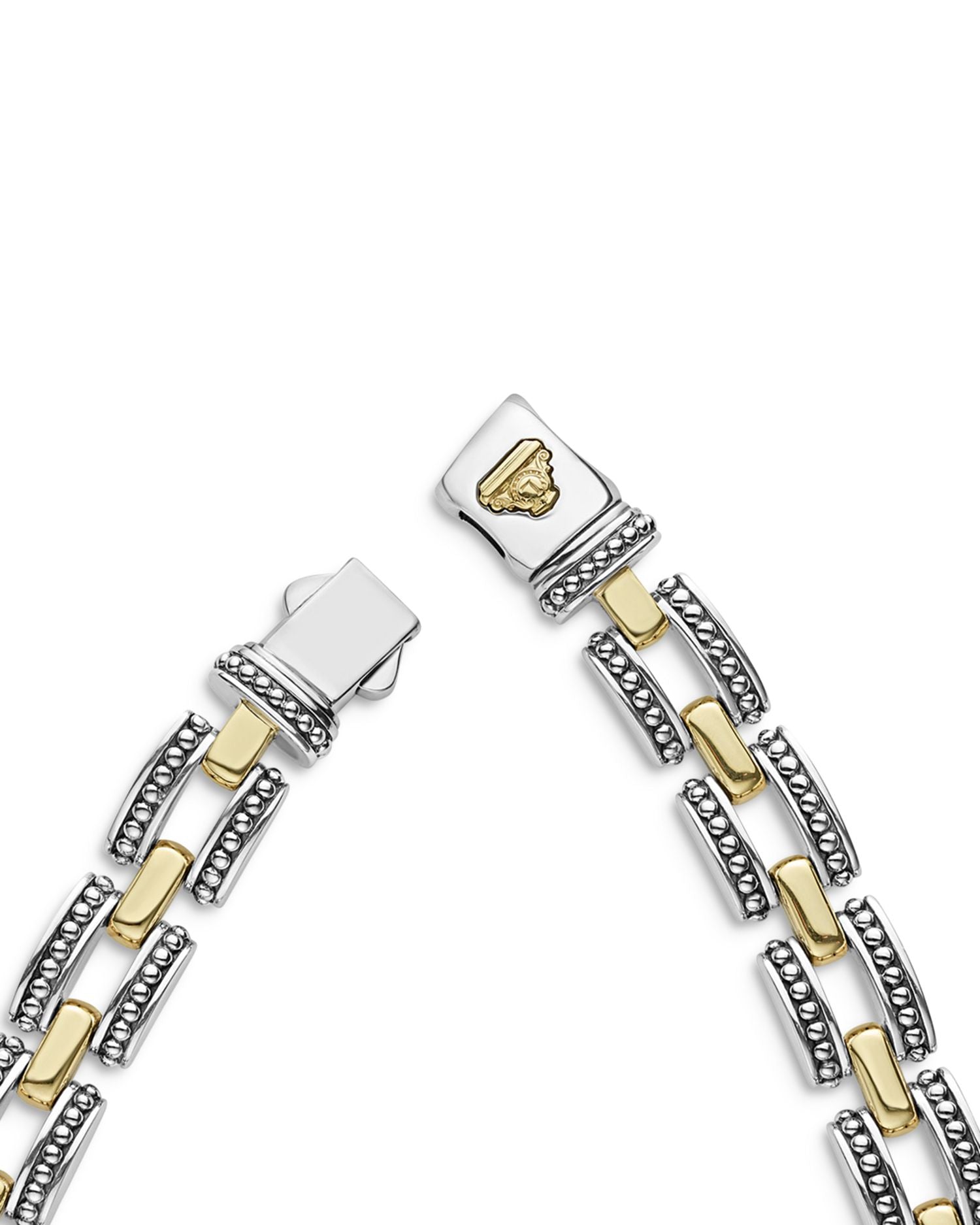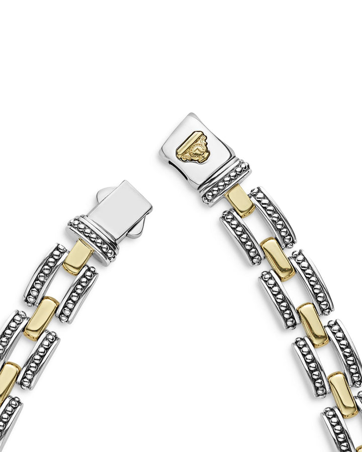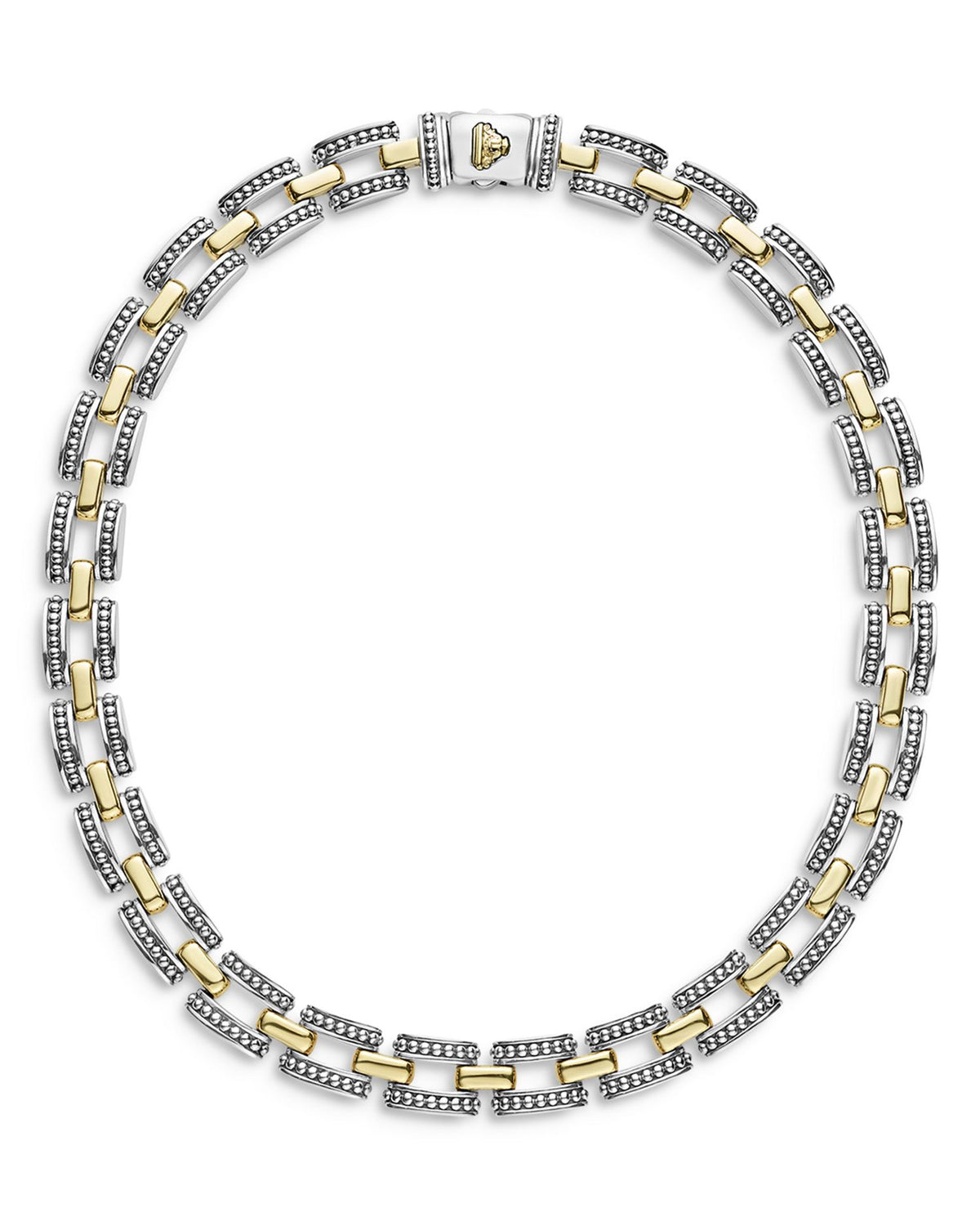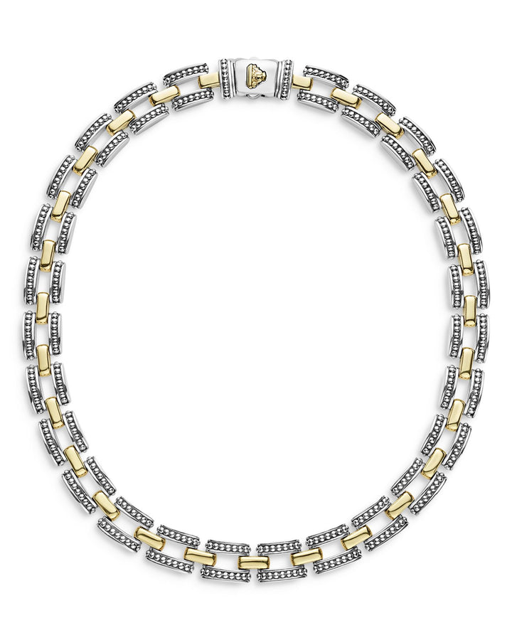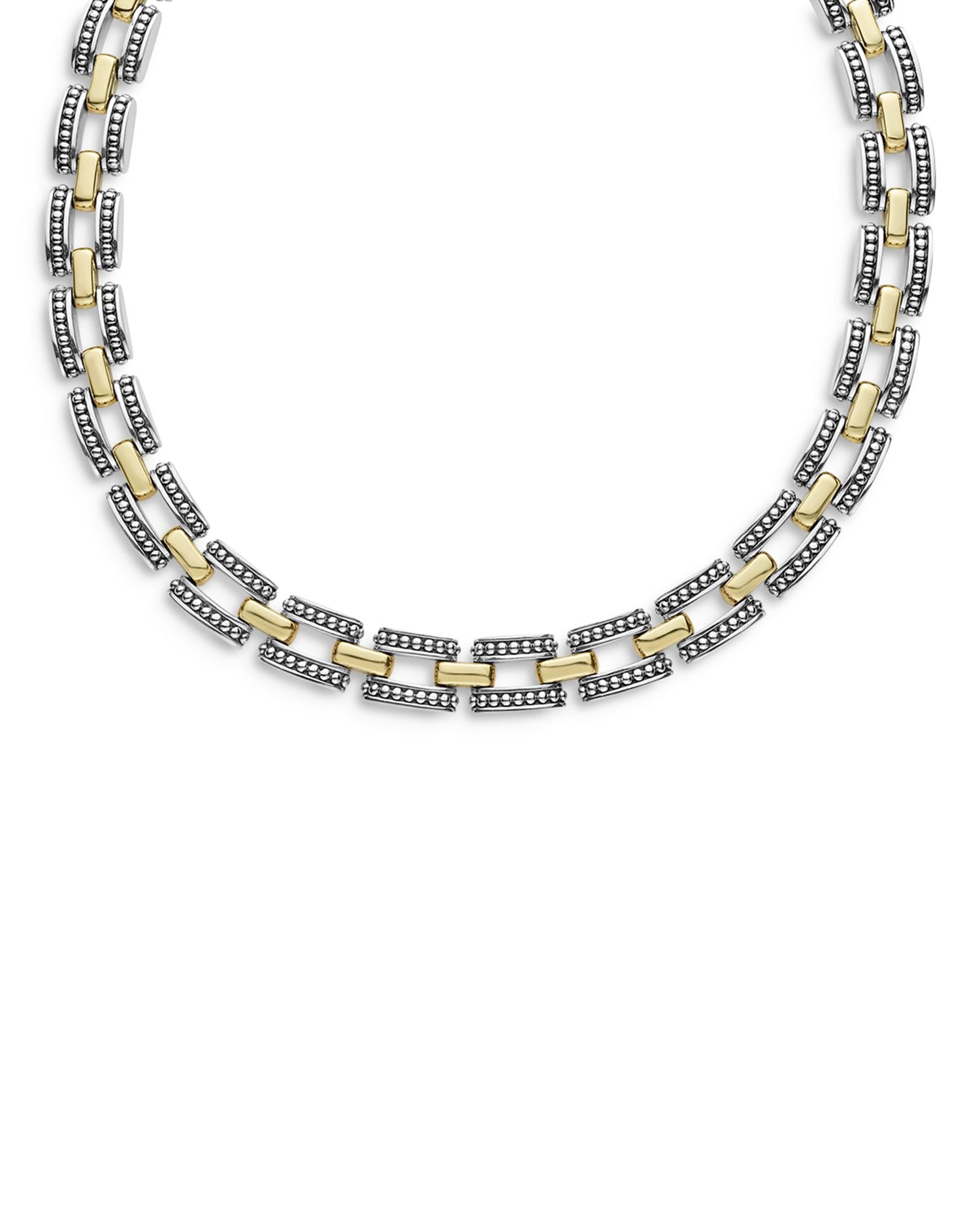 These 18K Yellow Gold & Sterling Silver High Bar Link Statement Necklaces by LAGOS showcase chic simplicity. Featuring sterling silver beaded links alternating with luxurious 18K gold, these necklaces from the High Bar Collection exude elegance and modernity.