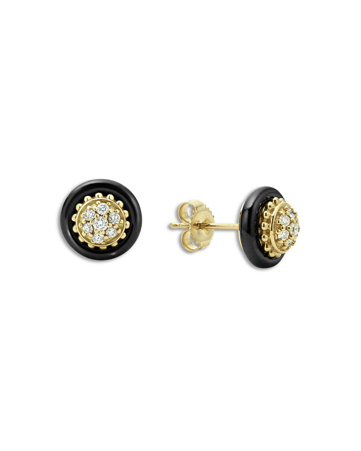 These Meridian 18K Yellow Gold and Black Caviar Diamond Stud Earrings by LAGOS offer a striking contrast of mini diamond clusters framed by sleek black ceramic discs. A part of the Meridian collection, these studs exude modern elegance and bold luxury, perfect for special occasions or daily statement pieces.