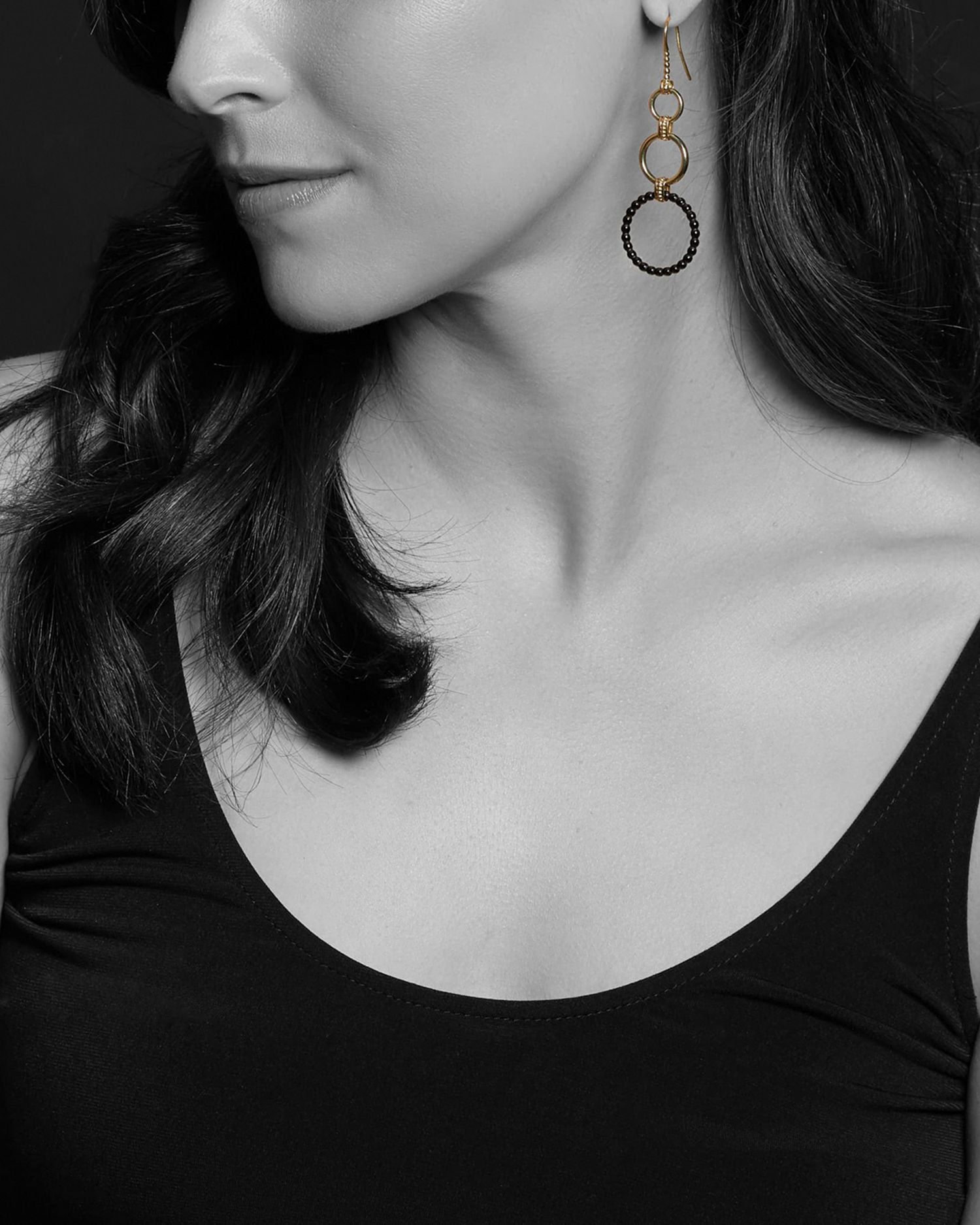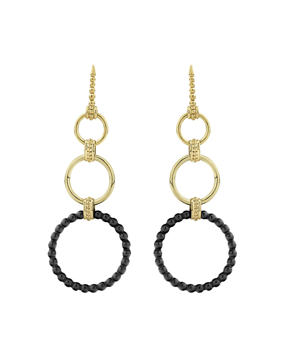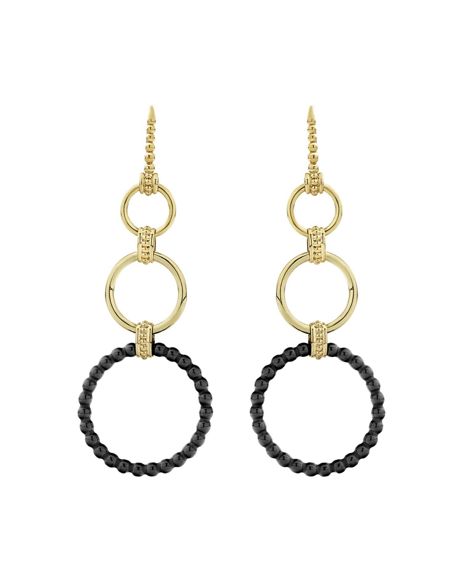 These Meridian 18K Yellow Gold & Black Caviar Drop Earrings by LAGOS blend modern elegance with a bold edge. Featuring 18K yellow gold and sleek black ceramic circles, these earrings are designed to pair seamlessly with other pieces from the Meridian collection. Their dramatic length enhances both day and evening looks.