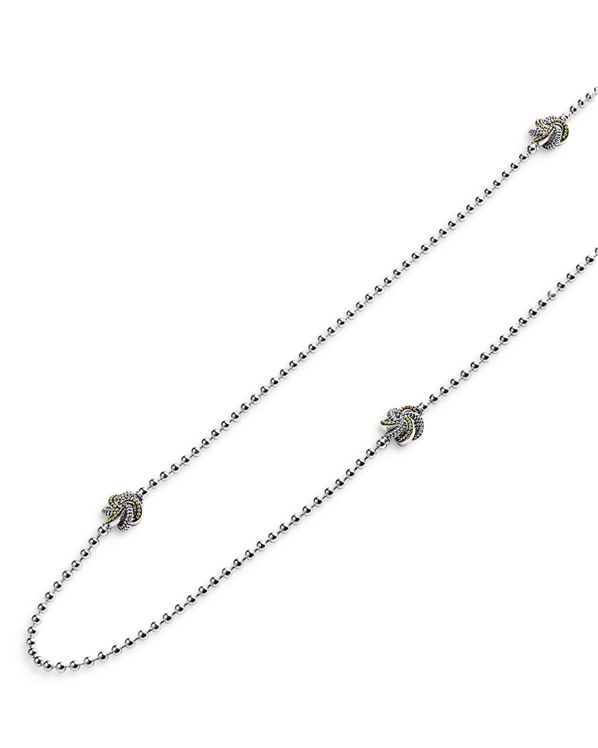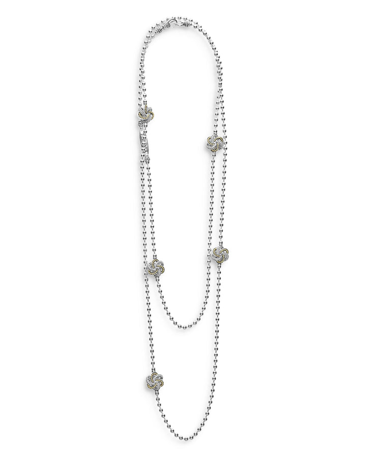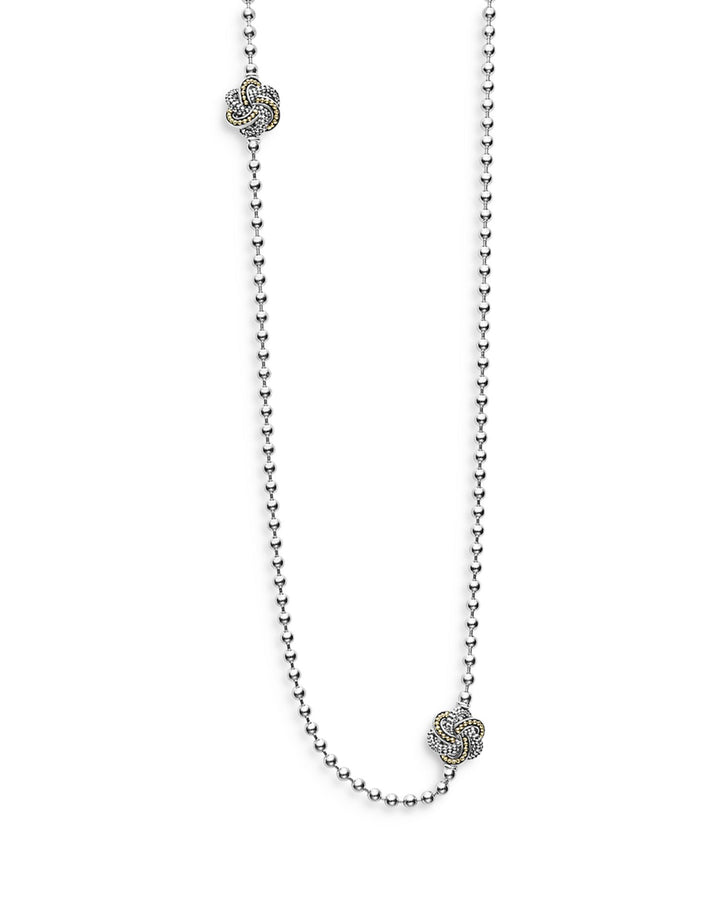 The Sterling Silver & 18K Yellow Gold Love Knot Station Necklace by LAGOS is a timeless design featuring five two-tone love knot stations. Suspended on a sterling silver ball chain, it’s an ideal piece to symbolize eternal bonds and love.