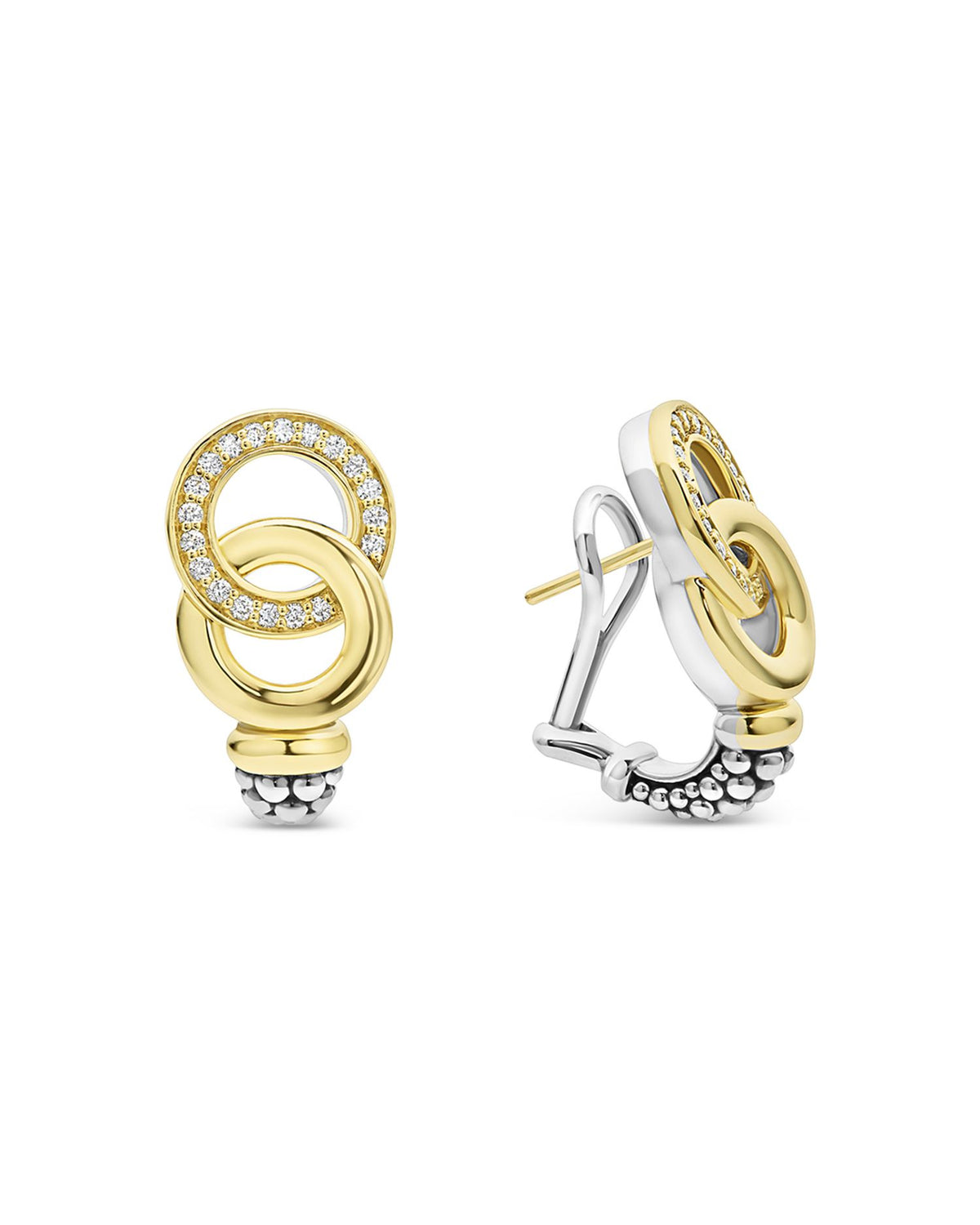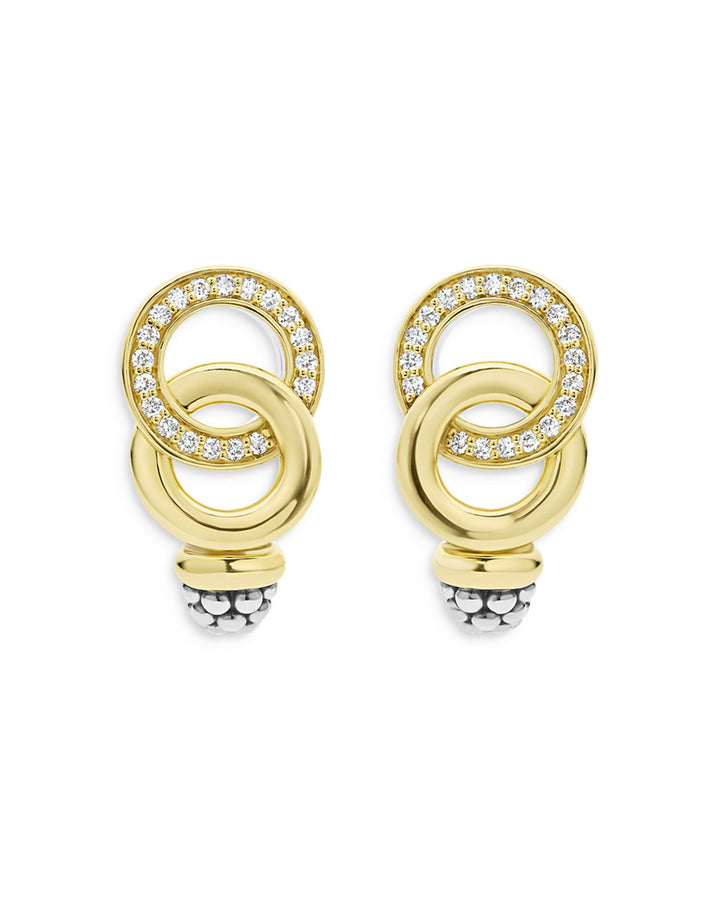These Signature Caviar Diamond Statement Earrings by LAGOS are a bold expression of elegance and style. Featuring two-tone interlocking rings with shimmering diamond details, they are perfect for making a lasting impression on any occasion.