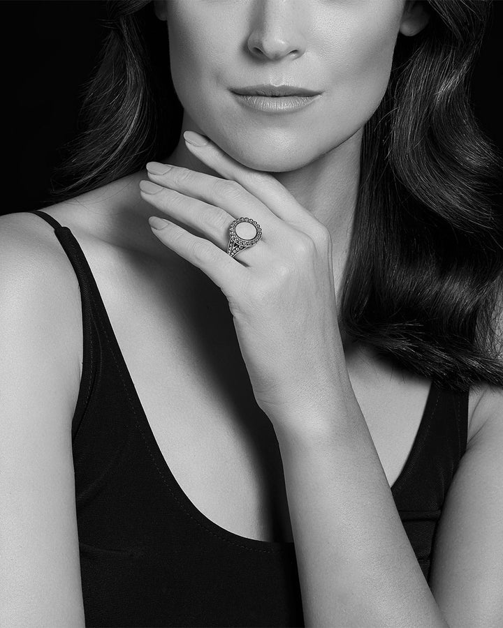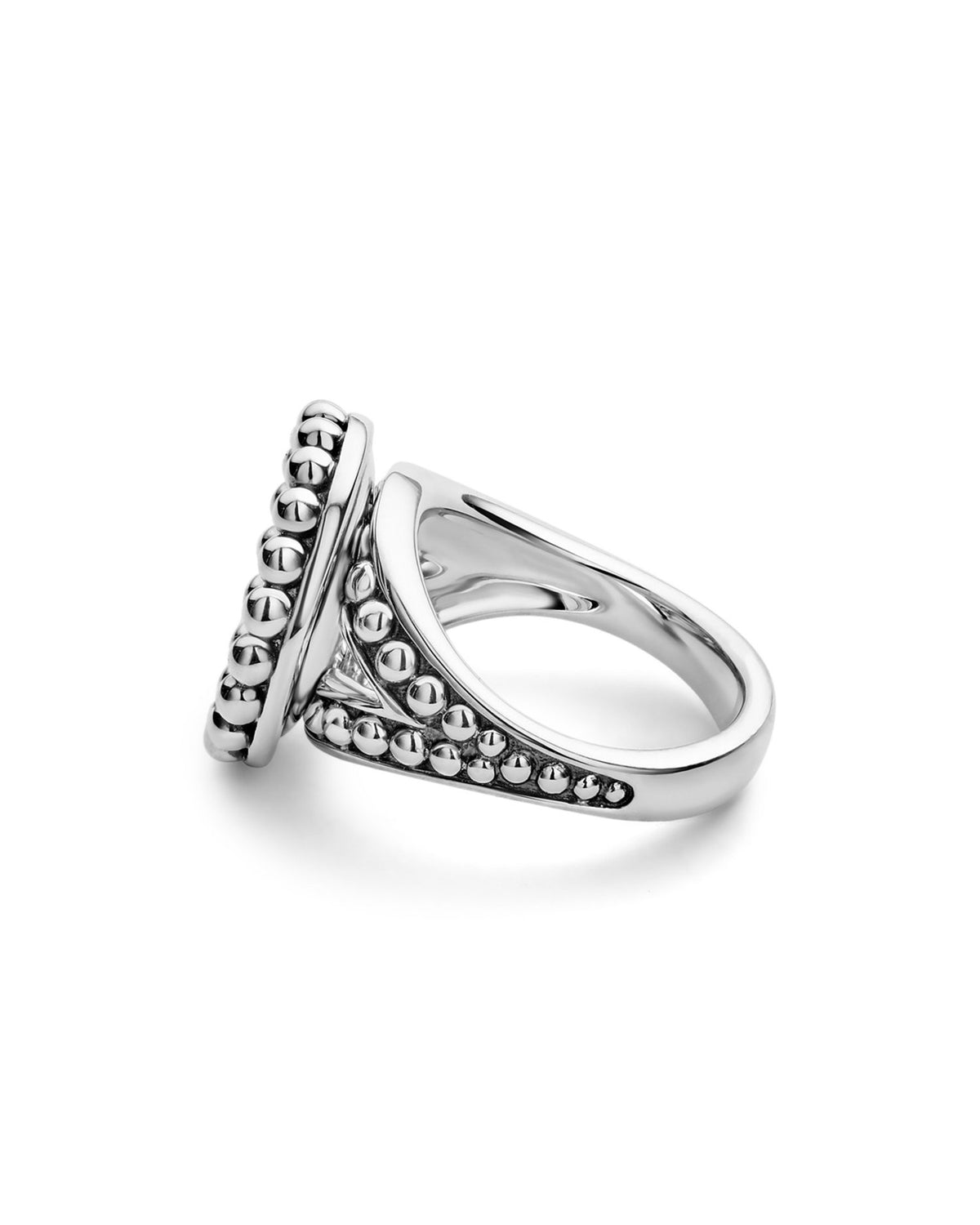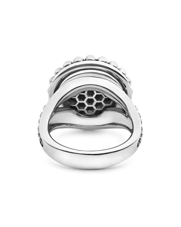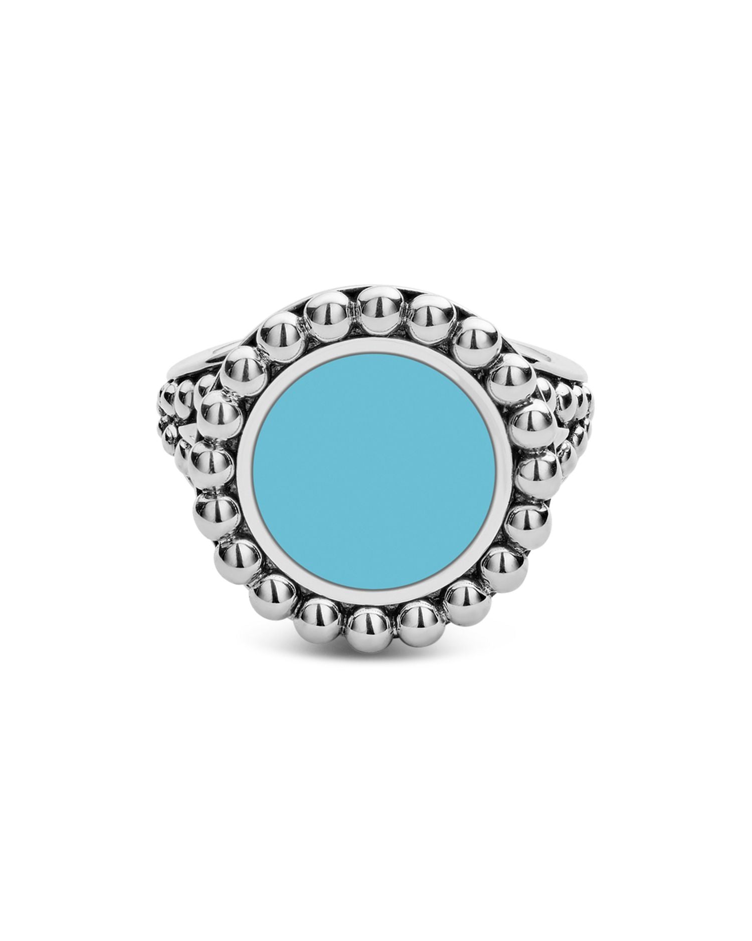 This Sterling Silver Maya Blue Ceramic Ring by LAGOS is a modern accessory from the Maya collection. The vibrant light blue ceramic contrasts beautifully with the silver Caviar beading, offering a playful yet elegant aesthetic.