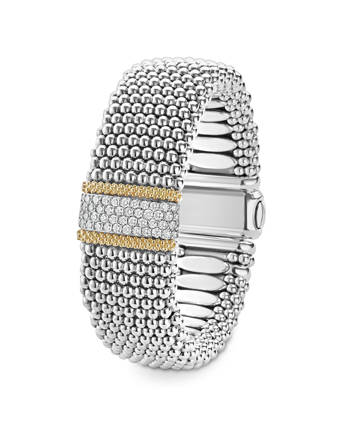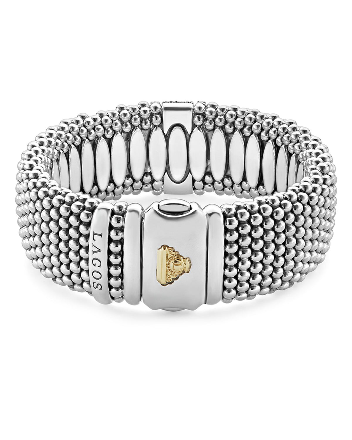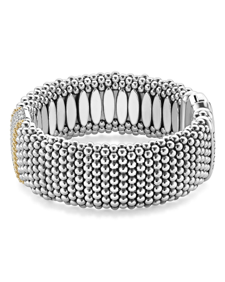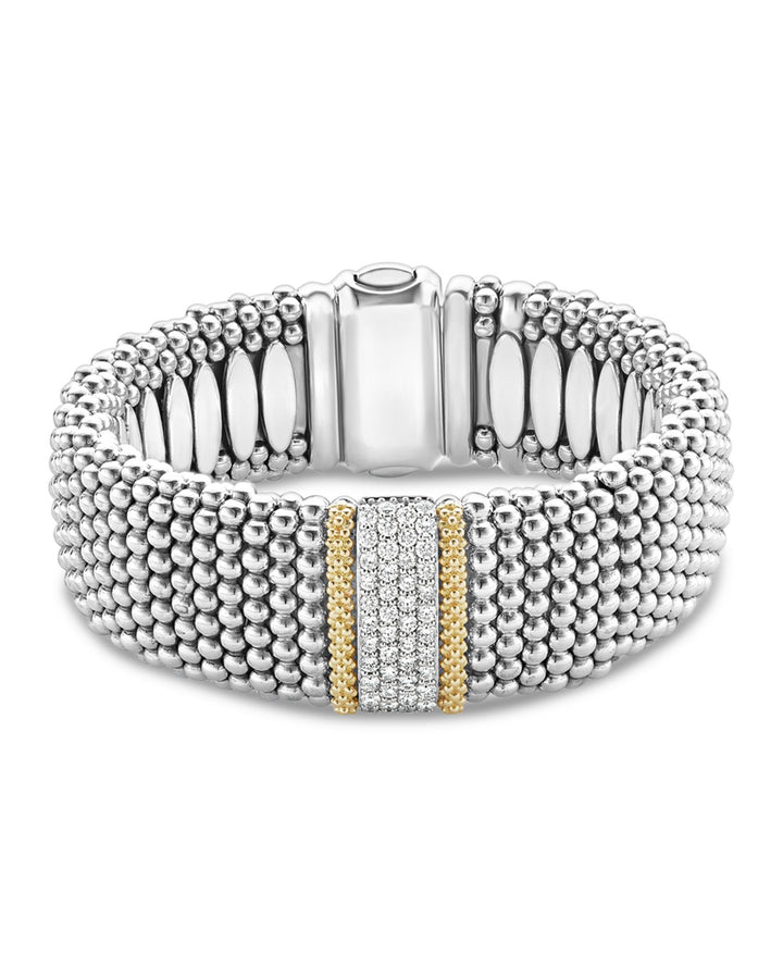 This 18K Gold & Sterling Silver Diamond Lux Single Station Bracelet by LAGOS is a masterpiece of sophistication. Featuring a single diamond station framed by 18K gold and sterling silver Caviar beading, this bracelet embodies timeless elegance and brilliance.