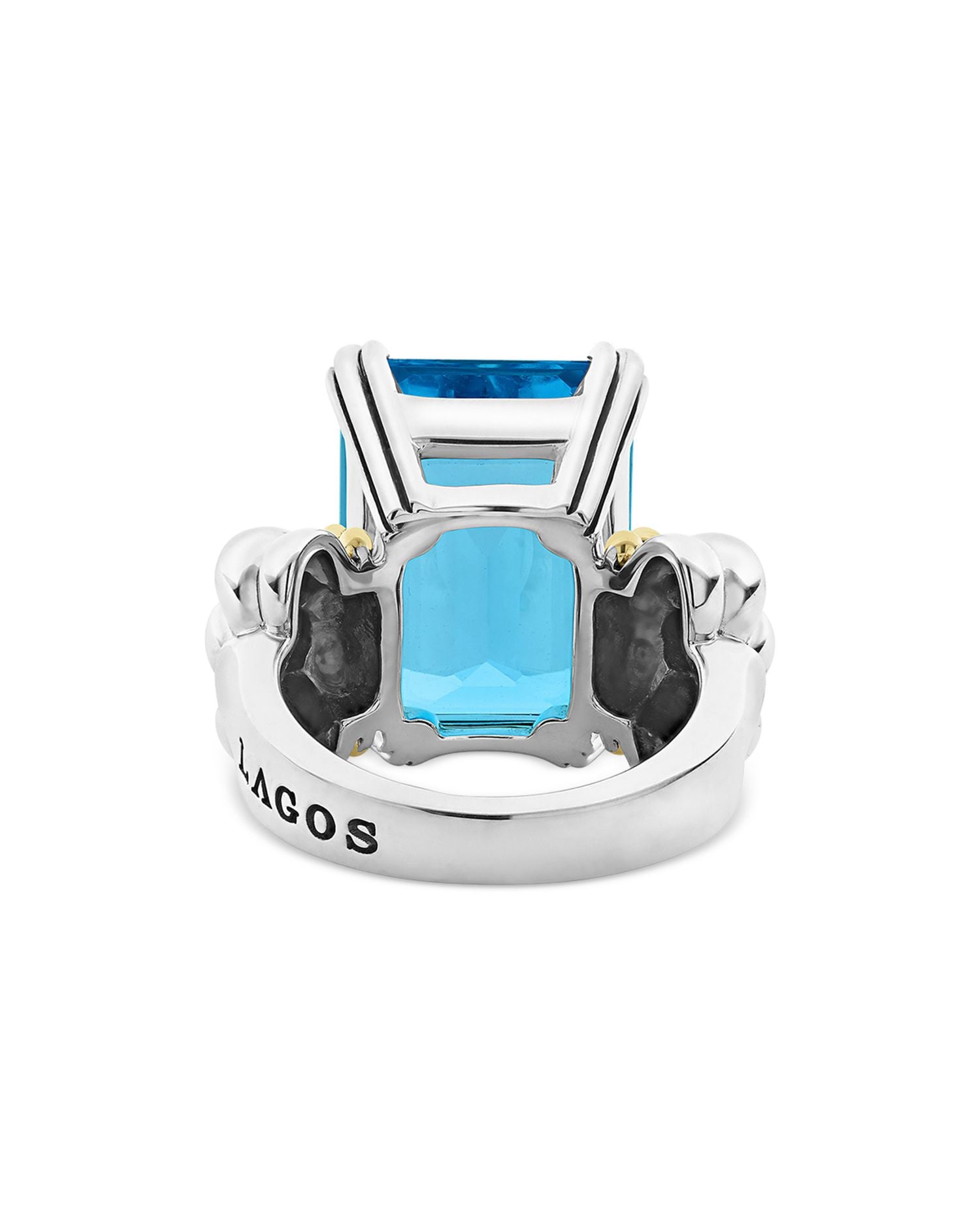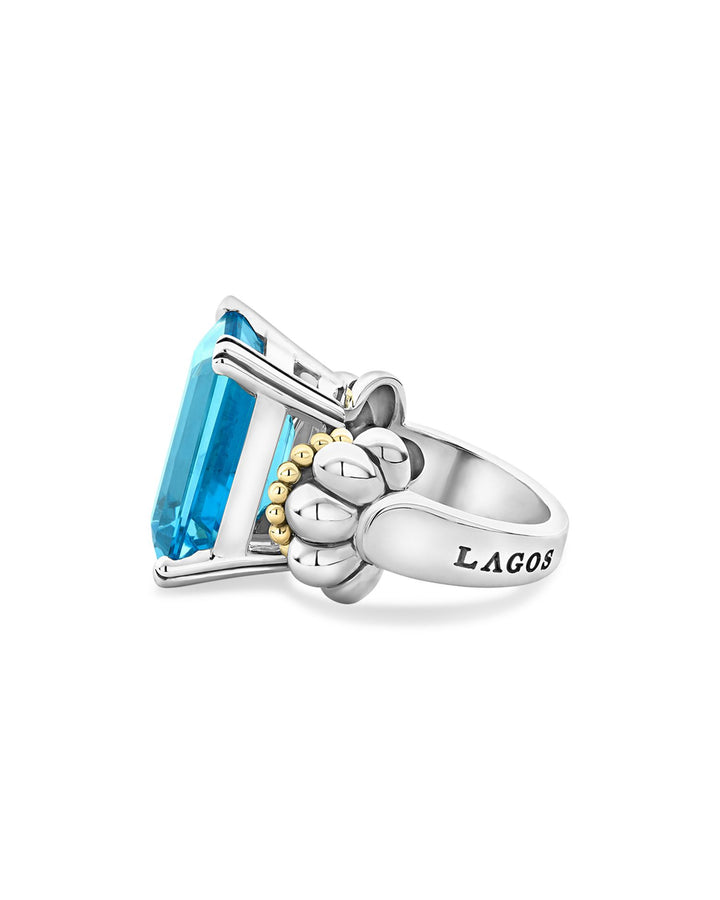 This Sterling Silver & 18K Yellow Gold Glacier Blue Topaz Ring by LAGOS is a captivating piece from the Glacier collection. Centered by an emerald-cut blue topaz in a prong setting, the design is enhanced with golden Caviar beading, creating a harmonious blend of classic elegance and contemporary flair.